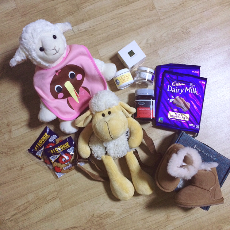 뉴질랜드 키위새 턱받이, 아기 어그, 애착 인형이 되길 바라는 양 인형, 인형인 줄 알았는데 가방이었던 양 백팩, 튼살크림과 영양크림, 그리고 간식들까지.