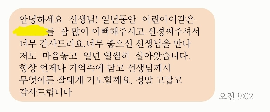 방학식을 하기 며칠 전 은혜의 어머니로부터 문자를 받았다. 어떻게 답장을 드려야 할지 고민이 될 정도로 진심이 가득 담긴 문자였다. 이런 문자를 받을 정도로 잘 한 건 없는데, 더 많이 신경 써 줄 걸. 나를 반성하게 하는 문자였다.