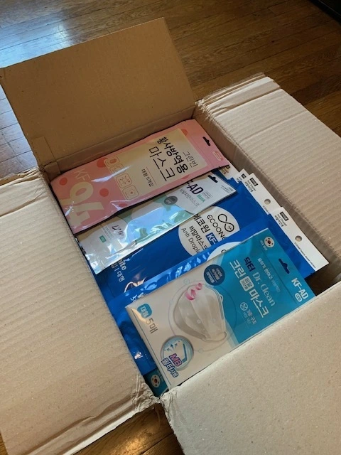 빼곡히 들어찬 마스크. 설마 이 박스 하나가 다 마스크인가 싶었는데 정말 그랬다. 법이 바뀌어 재외국민 1인당 한 분기당 90개까지 마스크 발송이 가능해져서 아빠가 우리 가족 넷을 위해 360개를 보내주셨다는 걸 나중에야 알았다. (반출 갯수 제한이 있는 마스크는 해당 박스에 마스크 외에는 아무 것도 넣지 못한다는 것도.) 마스크가 올 줄 모른 것은 아니었다. 다만 여름용 비말 마스크와 KF94를 합쳐서 대략 백여 개를 지마*에서 집으로 배송해서 대략 그 정도 받겠거니 예상하고 있었다. 그런데 아빠가 최대 수량에 꽉꽉 맞춰 추가로 구매해 보내주신 것이다. 봄에 보내주신 마스크와 필터까지 합치면 이제는 500개는 족히 넘는 마스크가 있는 것 같았다. 이쯤이면 우리 동네에서는 마스크 재벌이다.