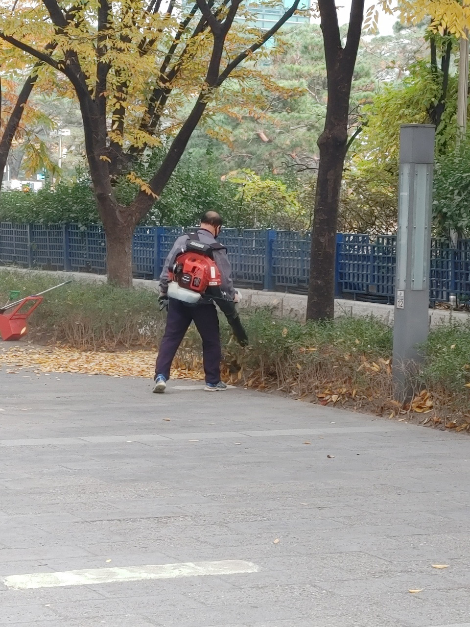 요즘 길에 이 분들 많이 보인다. 둥글고 기다란 원통형 장비로 바람을 훅훅 불어서 낙엽을 한 곳으로 모으는 분들이다.