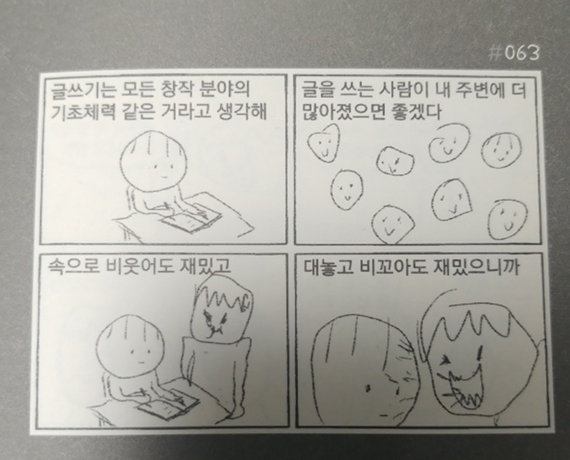 책 <작가의 목소리>를 쓰는 데에 송현규의 이 만화 <혐규만화>의 영향이 있었음을 숨길 수 없다. 빌어먹을 알고리즘으로 sns에서 늘 보이는 게 글쓰기 관련 어쩌고저쩌고 여럿이서 모여 으쌰으쌰 같이 힘내서 글을 써봅시다, 하는 건데... 아니, 정말 타인의 글쓰기를 그렇게나 응원을 해줄 수 있다고? 못 쓴 글을 보며 짜증을 내거나, 잘 쓴 글을 보며 질투를 하는 게 아니라, 그렇게 천사와도 같은 모습을 보일 수 있다고? 싶었으니까.