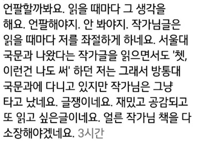 독자님께서 왜 이런 내용의 댓글을 달았는가 하면, 바로 어제 인서타에 올린 글의 내용 중에서 무명 글쟁이 이경은 대학을 나오지 않았다아아, 하는 부분이 있어서 그런 게 아닌가 싶은데, 엣헴.