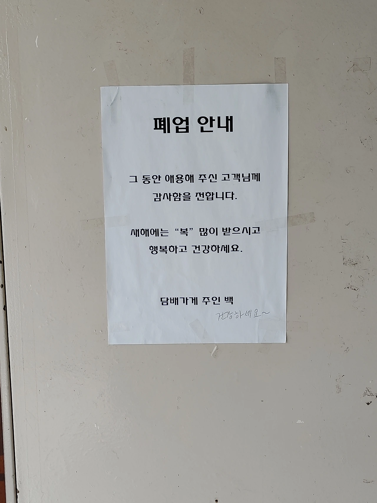 폐업 안내문에 붙은 건강의 기원은 그동안 담배를 팔아오던 담배 가게 주인이 고객에게 할 수 있는 최대의 덕담이 아니었을까 싶기도 하고.