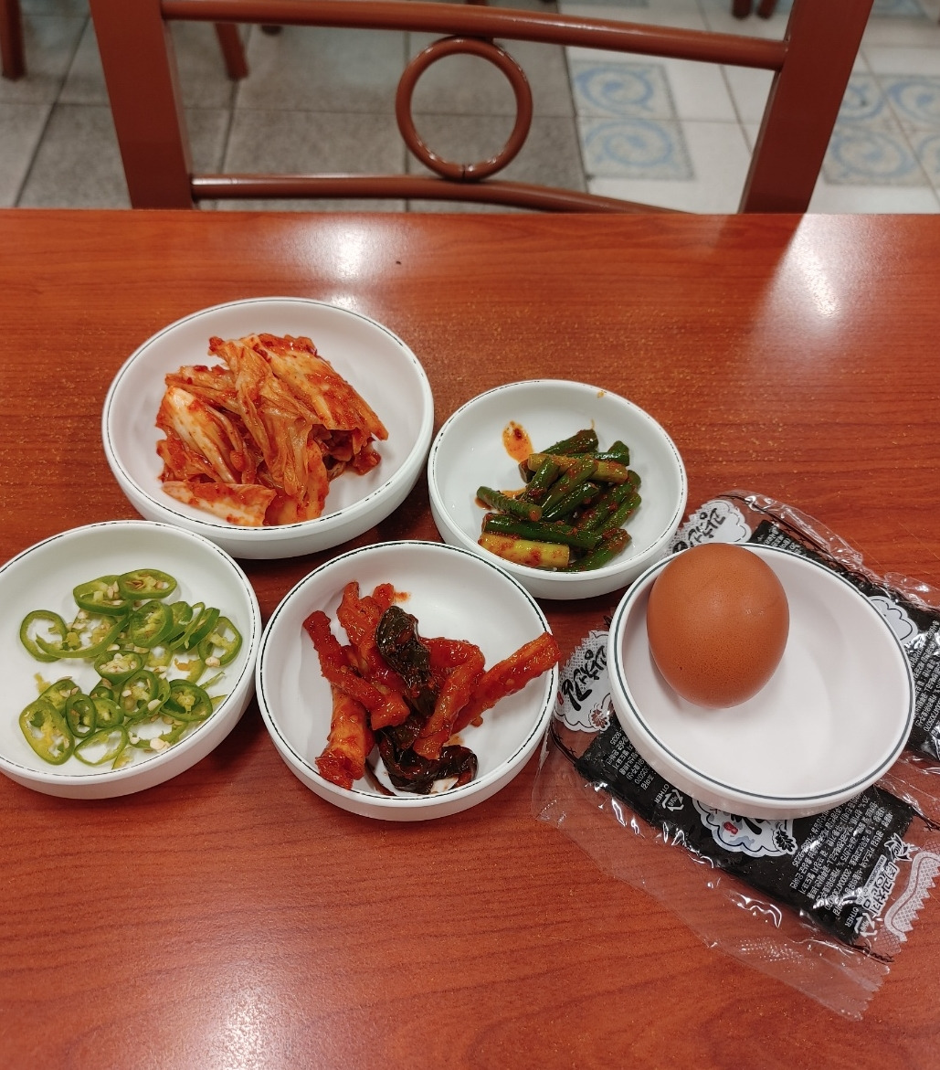 여기 식사 메뉴 몇 가지 더 있긴 있는데, 그건 그냥 장식용인 거 같고, 가게에 들어가면 자동으로 주방에 콩나물 국밥 주문이 들어가는 시스템, 헤헷. 자리에 앉아 기다리고 있으면 공깃밥 하나에 반찬 3종 세트가 나온다 이거예영. 김치김치, 무말랭이, 마늘쫑무침... 이거 마늘쫑 맞습니까... 마늘대(?)인가. 이경이경 음식 에세이를 써보고 싶어도 처묵처묵 할 줄만 알지 당최 식자재나 음식 이름 등에 대해 아는 것이 없다... 아는 것 없이 처먹을 줄만 아는 이경 생키를 규탄한다... 암튼 김치, 무말랭이, 마늘쫑 모두모두 아삭아삭 상큼상큼 맛있어서 이 반찬 3종만으로도 밥 한 공기 뚝딱이 가능하지만, 콩나물 국밥이랑 같이 먹으면 더 맛있으니까능, 자제력을 발휘하여 콩나물 뚝배기가 나오기를 기다려봅니다.