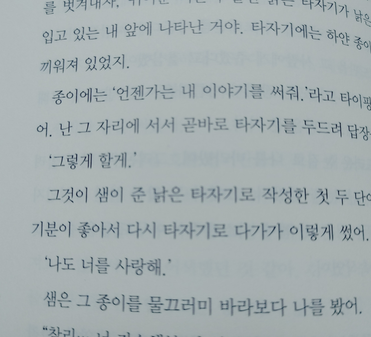소설에서 가장 좋아하는 장면은, 샘이 찰리에게 타자기를 선물하면서, '언젠가는 내 이야기를