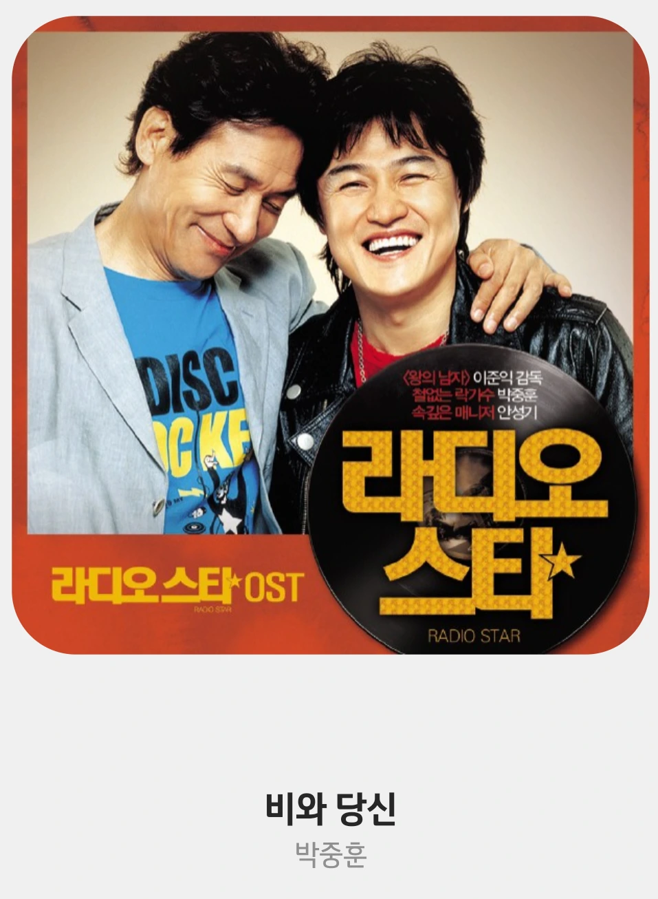 가끔은 전문가수가 아닌 이들이 부르는 노래가 즐거울 때가 있다. 그러니까 배우 같은 직업군의 사람들이 부르는 노래들. 젊은 시절의 김희애가 부르던 노래를 좋아하고, 그다음 세대로는 박신혜의 목소리가 좋았다. 이성경의 노래 실력도 대단하고. 그리고 남성 배우 중에서는 영화 [라디오 스타]에서 가수 최곤 그 자체를 연기했던 박중훈의 <비와 당신>을 사랑한다.