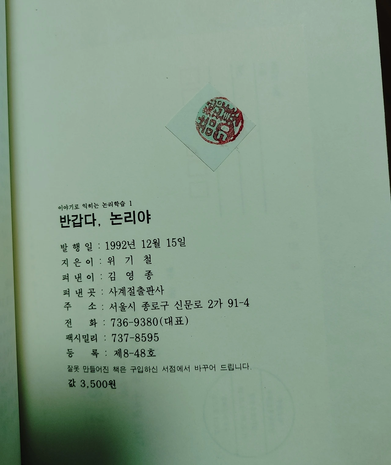 3,500원이라는 가격도 반갑고(?) 판권 페이지에 붙은 인지도 반갑다. 요즘엔 '인지'를 붙일 일이 거의 없다 보니 '인세'의 인자를 사람人으로 알고 있는 사람도 적지 않은 듯하다. 아마 시간이 갈수록 이렇게 생각하는 사람은 더 늘어날 것 같고. (보다시피 도장 印을 쓴다.)