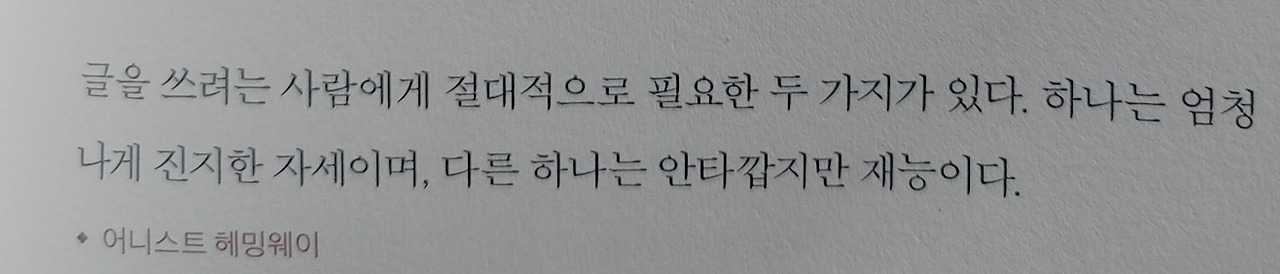 *글을 쓰려는 사람에게 절대적으로 필요한 두 가지가 있다. 하나는 엄청나게 진지한 자세이며, 다른 하나는 안타깝지만 재능이다. -어니스트 헤밍웨이-