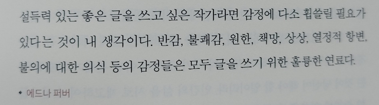 *설득력 있는 좋은 글을 쓰고 싶은 작가라면 감정에 다소 휩쓸릴 필요가 있다는 것이 내 생각이다. 반감, 불쾌감, 원한, 책망, 상상, 열정적 항변, 불의에 대한 의식 등의 감정들은 모두 글을 쓰기 위한 훌륭한 연료다. -에드나 퍼버-