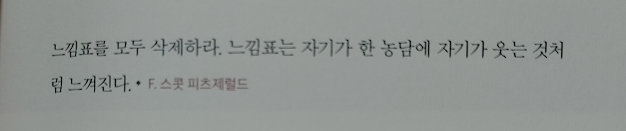 세계적인 문호들이 남긴 이런저런 글쓰기 명언들을 읽고 있으면, 멘탈에 도움이 되는 내용도 있고 실용에서 도움이 되는 내용도 있다. 스콧 피츠제럴드가 말했다는 느낌표를 삭제하라는 명언은 실용적인 측면에서 가장 도움이 되었던 글쓰기 팁이다. 단연코!