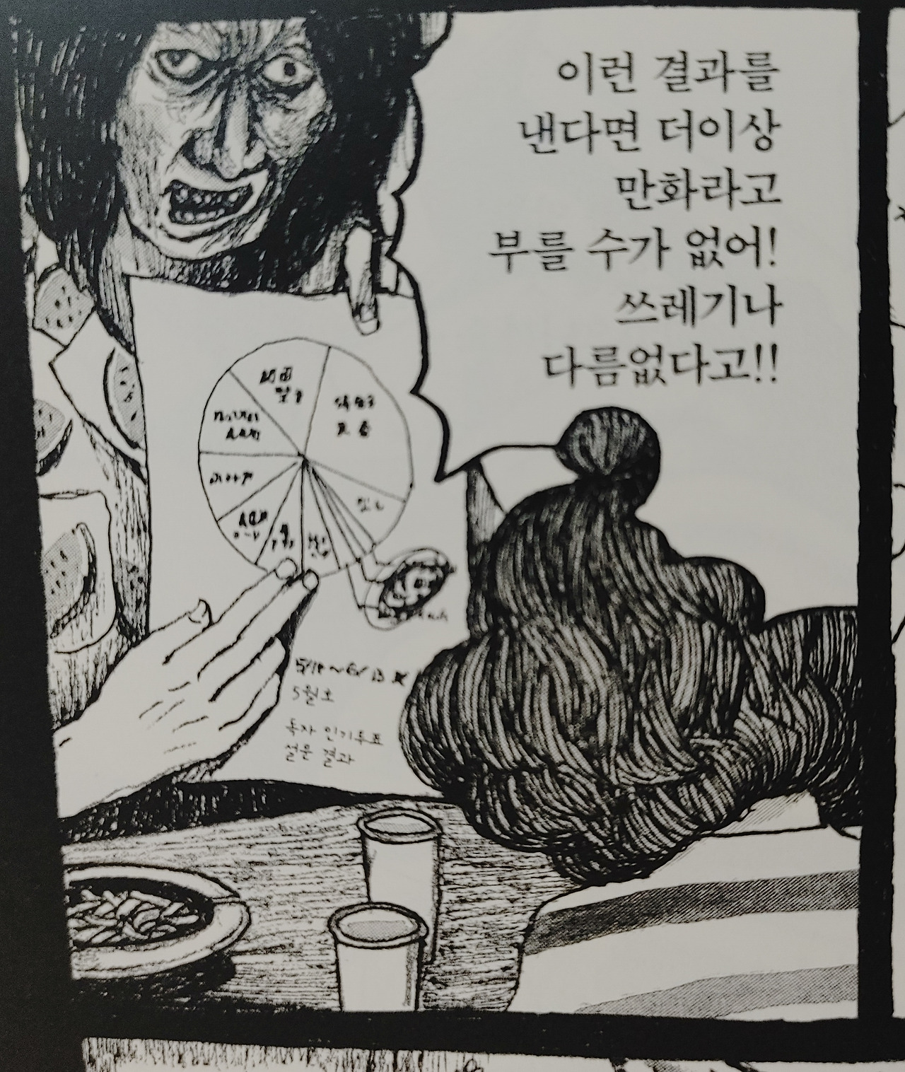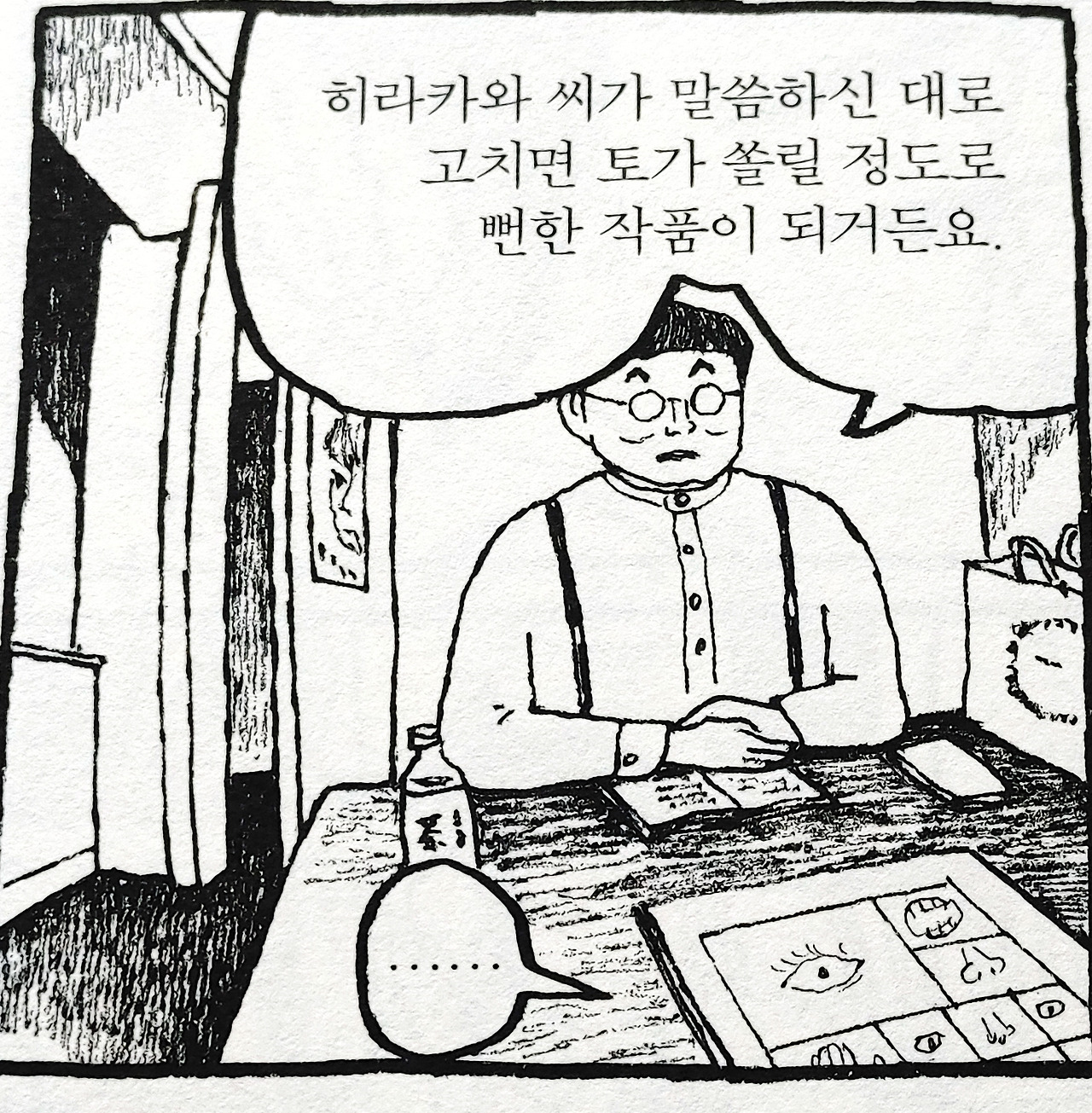만화를 그리다가 편집자에게 재떨이를 던진 작가, 편집자에게 "내 똥오줌을 받아먹을 각오는 있어?"라고 묻는 작가, 자신의 원고를 기억해 준 편집자에게 고마움을 전하는 작가, 타사의 편집자를 경계하는 담당 편집자의 모습에서 작가 인생을 논하는 작가, 험한 말로 작가를 윽박지르며 만화를 뽑아내는 편집자와 편집자의 요구 사항을 철저하게 무시하는 작가.