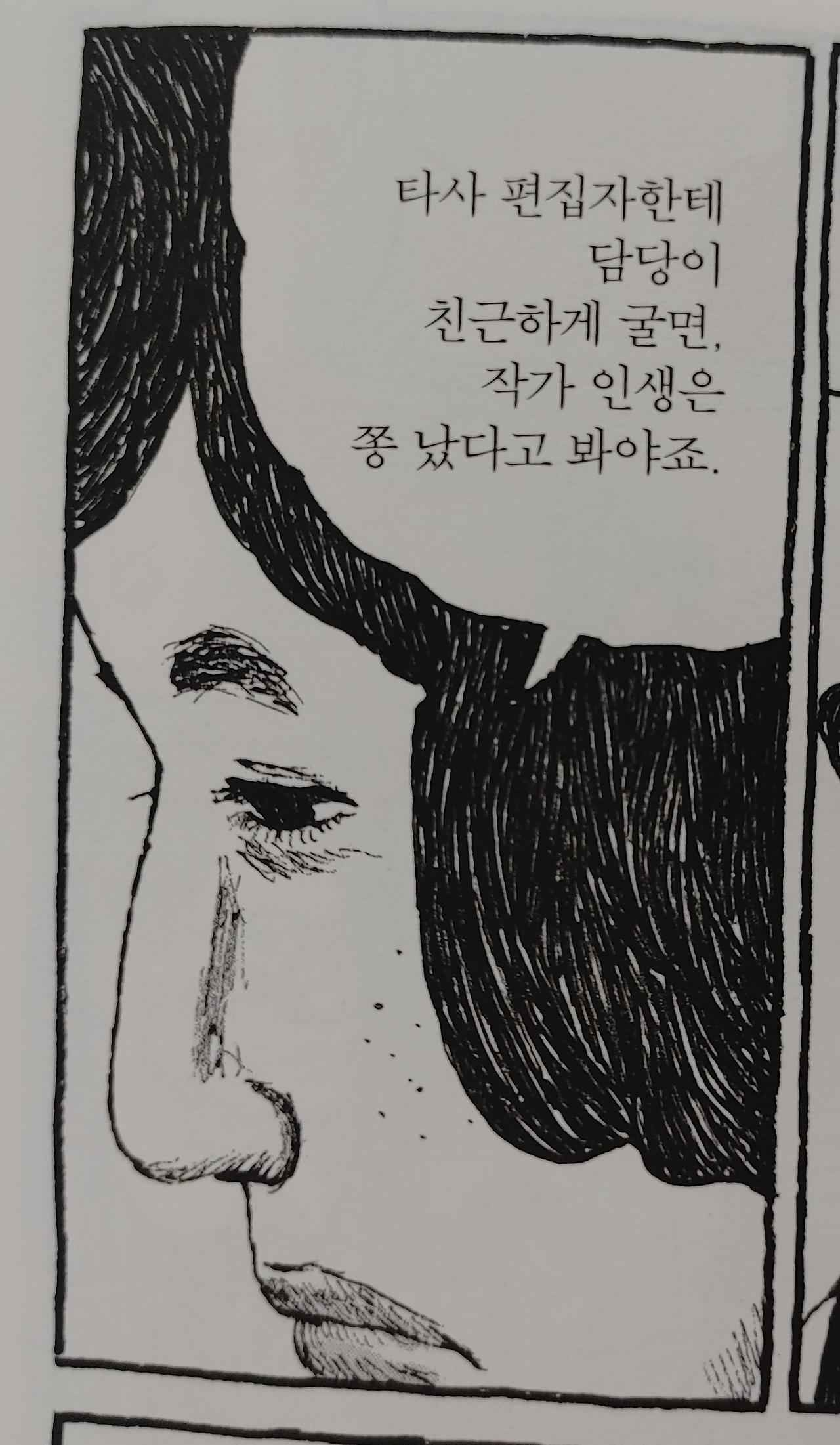 자의식 과잉의 작가와, 작가의 연재를 따낸 편집자에겐 시크하게 통화를 하고 끊고서 전화 밖에서 편집자를 향해 감사하다고 절을 올리는 작가.