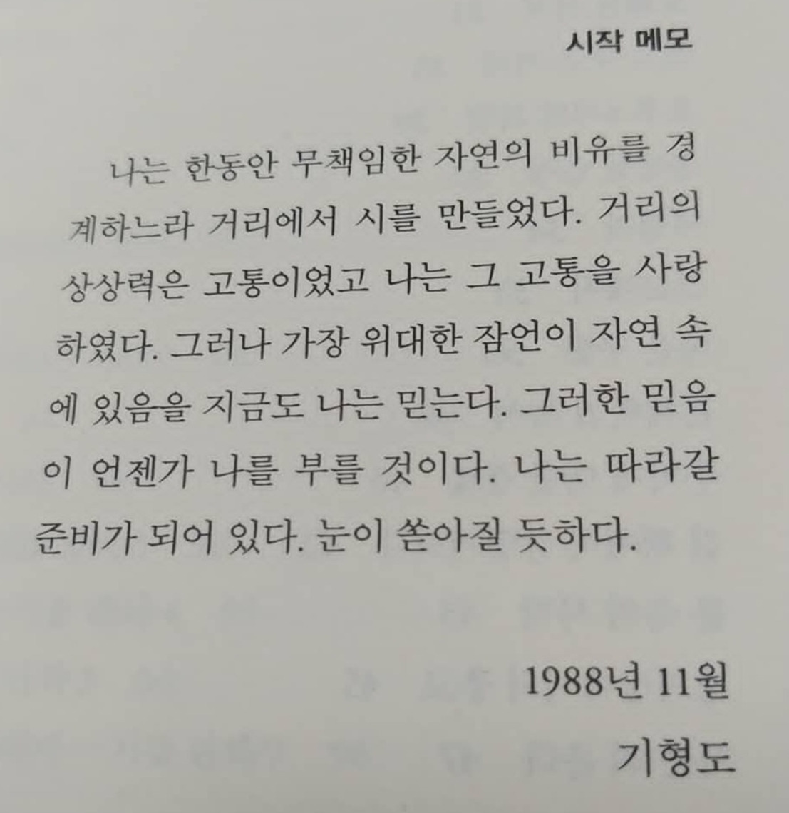 시인 기형도의 시집 <입 속의 검은 잎>에 실린 자서 '시작 메모'의 한 문장, '나는 따라갈 준비가 되어 있다.'를 좋아한다. 나에게 다른 글과 달리 시가 가지고 있는 가장 큰 특징이 무엇이냐고 묻는다면 단어의 조합에서 오는 생경함이라고 말하고픈데, '나는 따라갈 준비가 되어 있다' 하는 문장을 계속 되뇌이다 보면 게슈탈트붕괴까진 아니더라도 어딘가 생경한 느낌이 드는 것이다. 그러니까, 따라간다는 것은 뭔가 수동적인 자세인 것만 같은데, 준비가 되어 있다는 것은 또 어쩐지 무척이나 능동적인 자세인 것만 같아서. 나는 따라갈 준비가 되어 있다, 나는 따라갈 준비가 되어 있다, 하는 문장을 들여다보고 있으면, 이 사람의 삶을 대하는 자세가 수동적인 것인지, 능동적인 것인지 좀처럼 알 수가 없게 된달까.