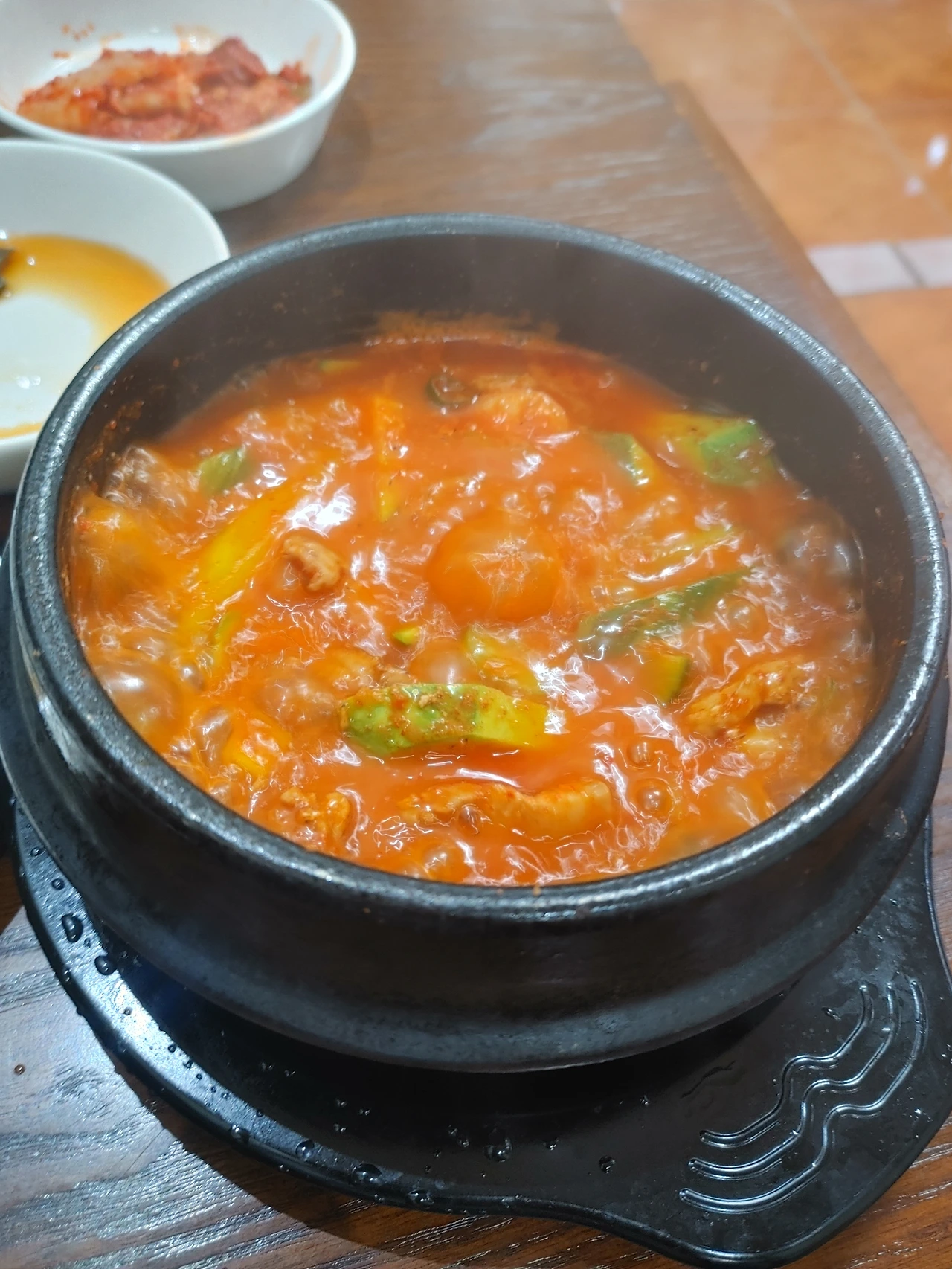 사회적 왕따인 나는 혼밥 하느라 제육은 언감생심, 그림의 떡, 꾸지 못할 꿈이라서 베이비 호박 애호박 찌개 시켜서 먹었다. 애호박 찌개인데 돼지고기도 많이 있어서 먹다 보면 이게 돼지찌개인지 애호박찌개인지 모르겠네.