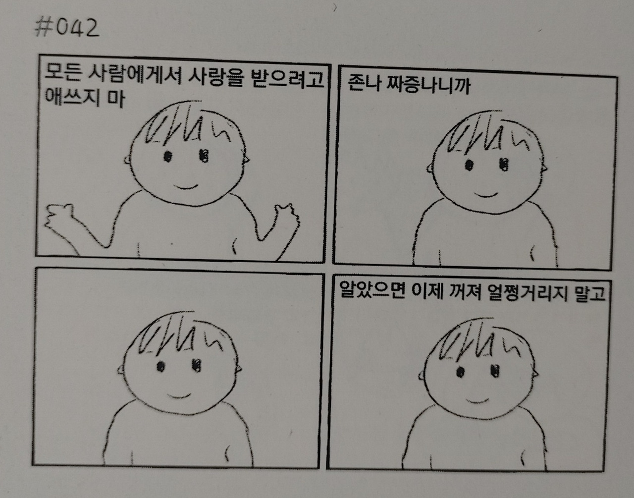 여하튼 며칠 전에는 새로이 쿨타임이 차서 책장에서 <혐규 만화>를 꺼내보았다. 여전히 공감이 가고 폐부 깊숙이 찔러주는 네 컷의 만화들. 특히 이번 재독에는 모든 사람에게 사랑받으려는 이에 대한 페이지에서 오랜 시간 머물렀다.