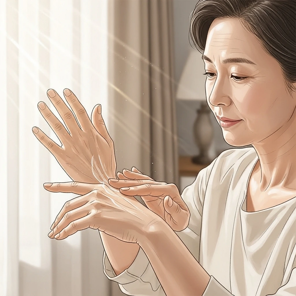 주름진 손등에 로션을 바르며 천천히 문지른다.