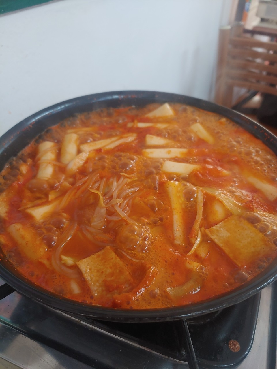 올려져있는 평생 처음 보는 떡볶이를 까스위에 올려 놓으시고...