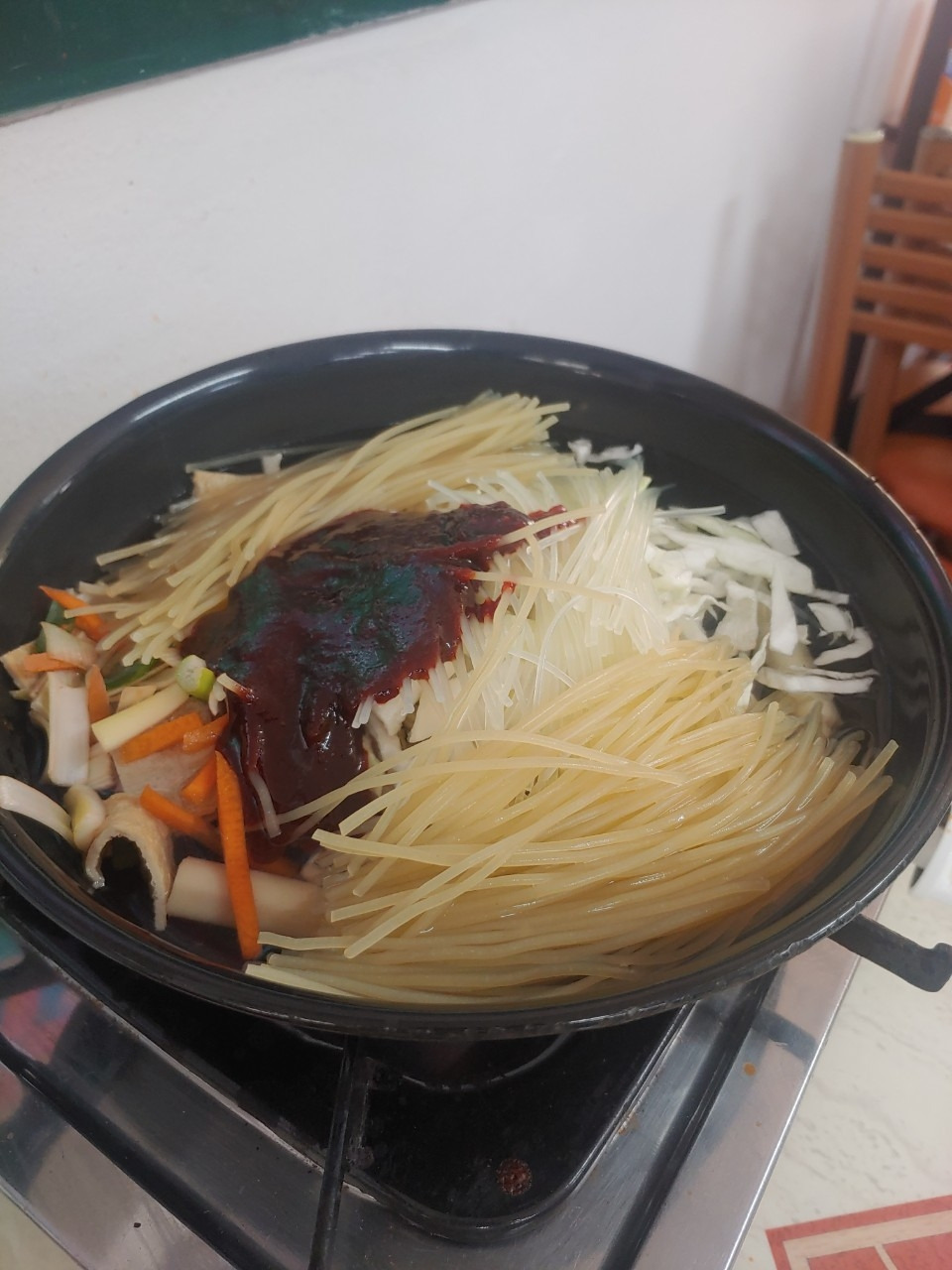 사장님이 검은 후라이팬에 떡과 오뎅 양배추,파,당면 가운데 검붉은 고추장이