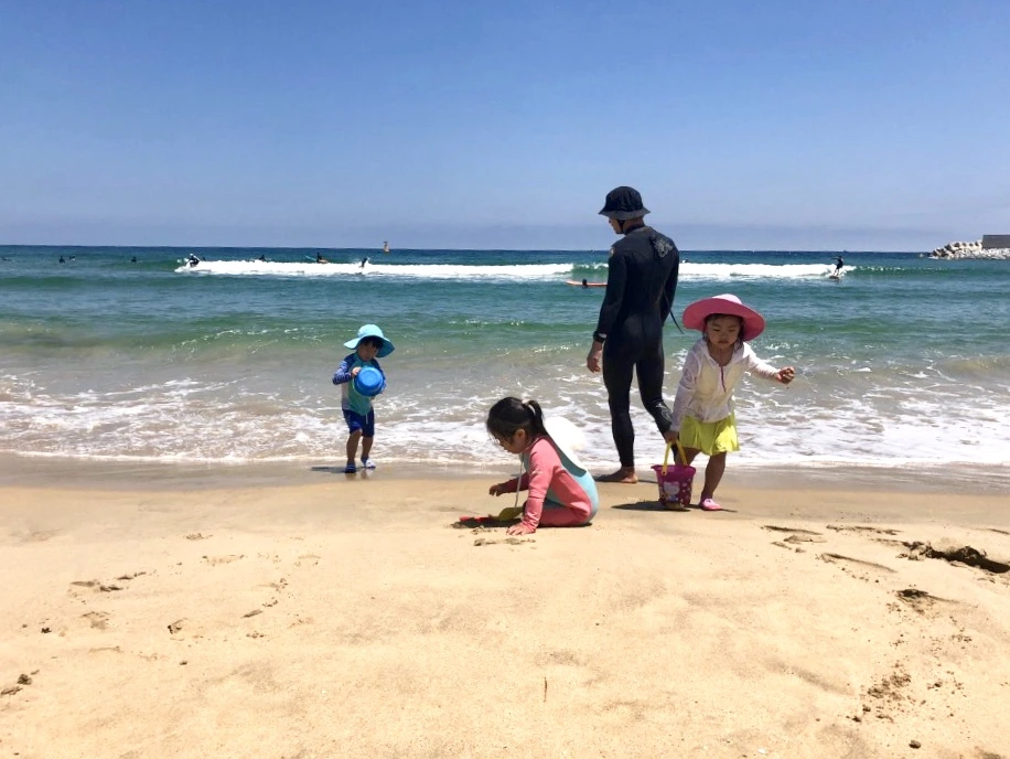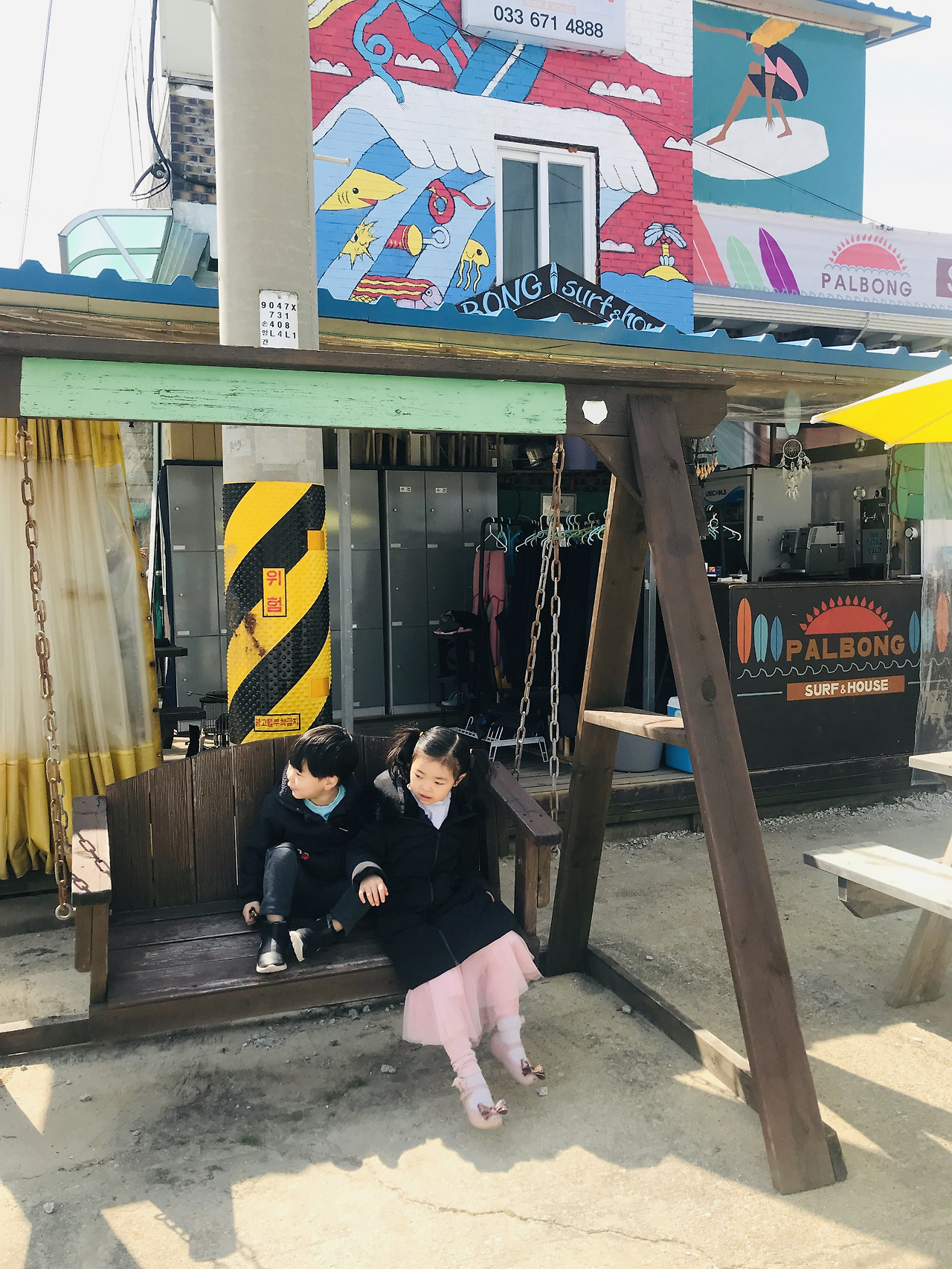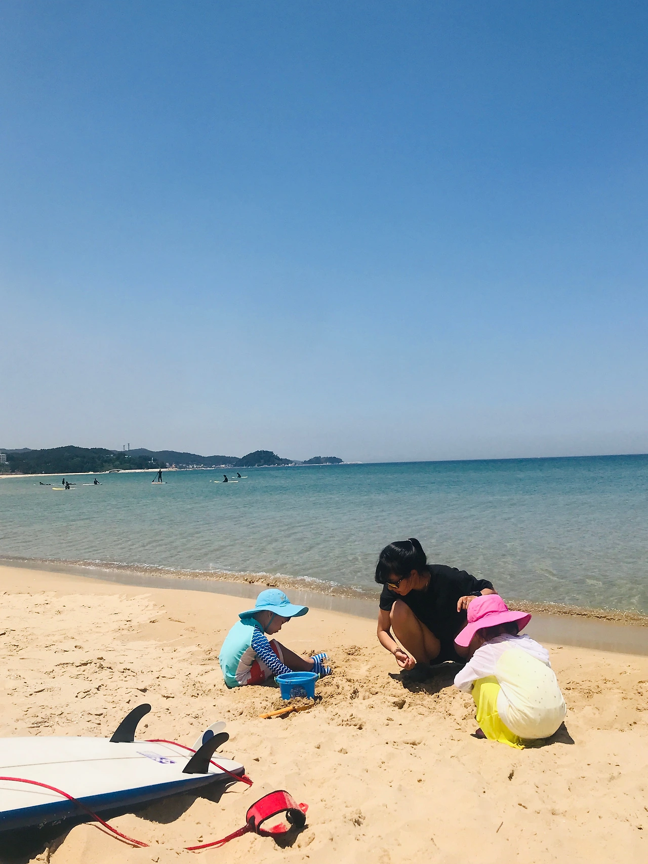 우리가 서핑을 시작한 초봄 꽃샘추위가 지나니 봄 햇살이 따뜻해져 왔다. 서울에는 미세먼지가 한창인데, 태백산맥을 넘어가니 일단 아이들이 미세먼지 마스크를 쓰지 않아도 되는 곳. 그리고 모래놀이가 가능한 계절이었다.