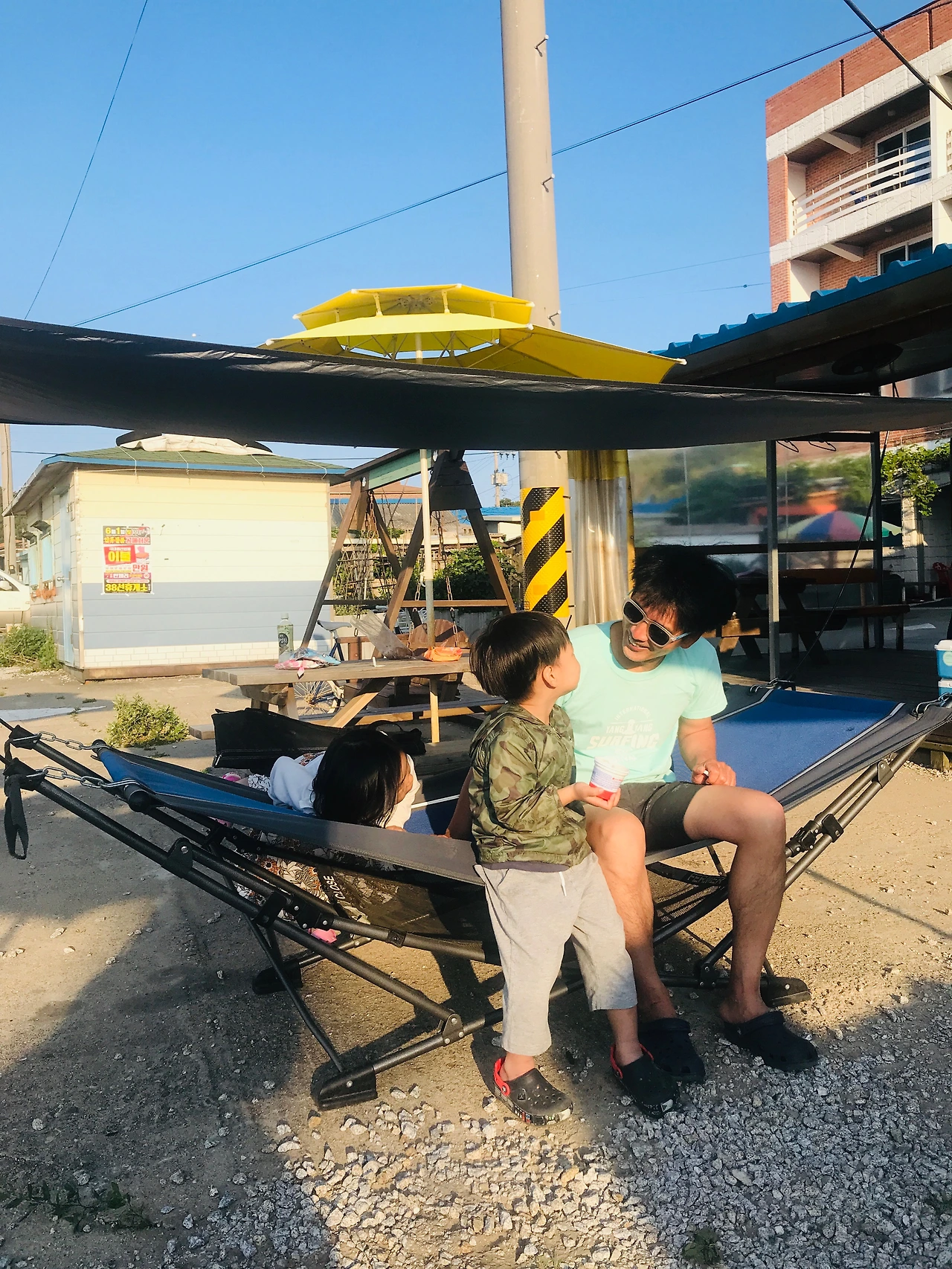반면에 앞마당이 있는 곳에선 유남매가 왔다 갔다 해도 괜찮은데다 미리 위험요소를 확인할 수 있어서 좋았다. 더구나 서핑샵 손님들이 슈트를 빌리거나 보드를 들고 드나드는 곳인데, 아이들이 그 동선에 방해가 되지 않을 수 있는 공간이라는 점이 더더욱.