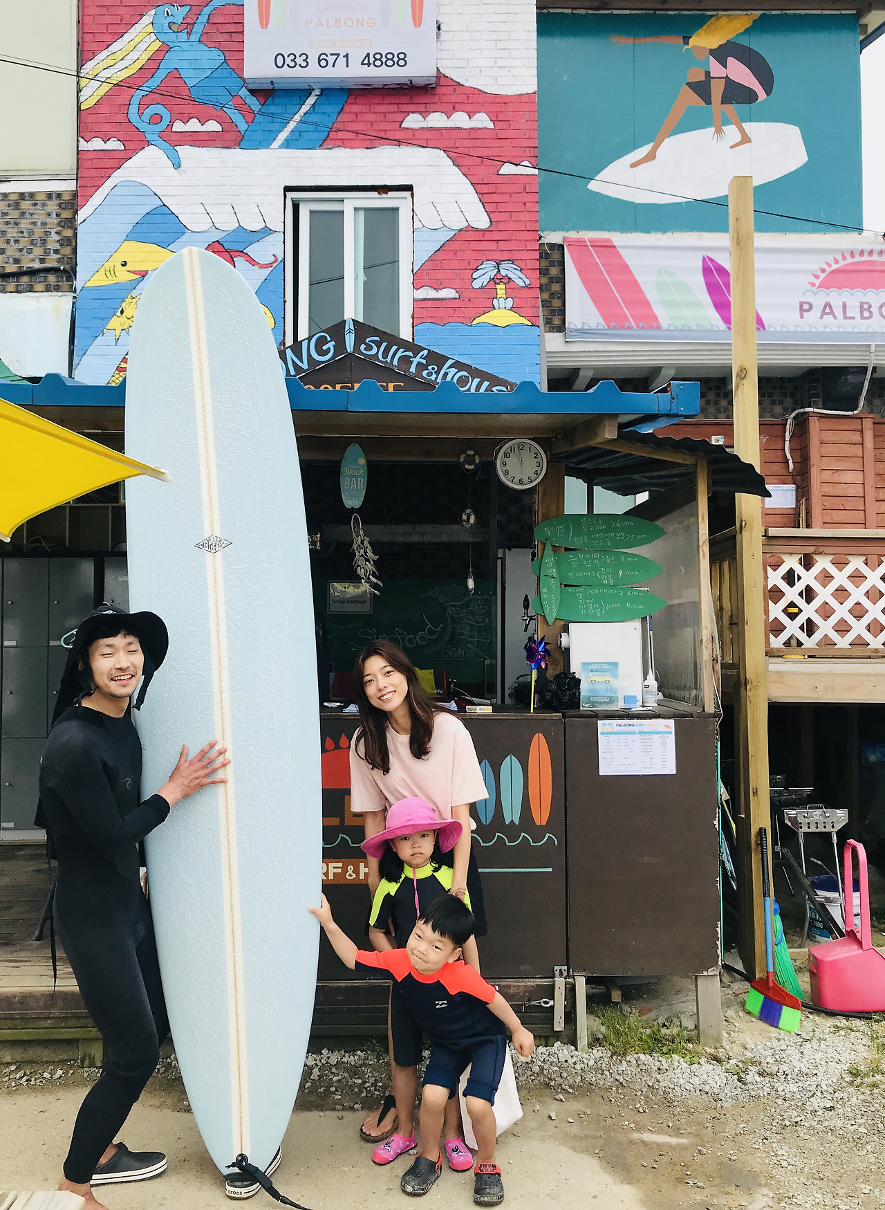죽도 인구해변 근처에 있는 서프보드샵 슈러스 (Schurrers)에서 운명처럼 쟈르르 윤기가 나는 하늘색 보드가 우리에게로 왔다.