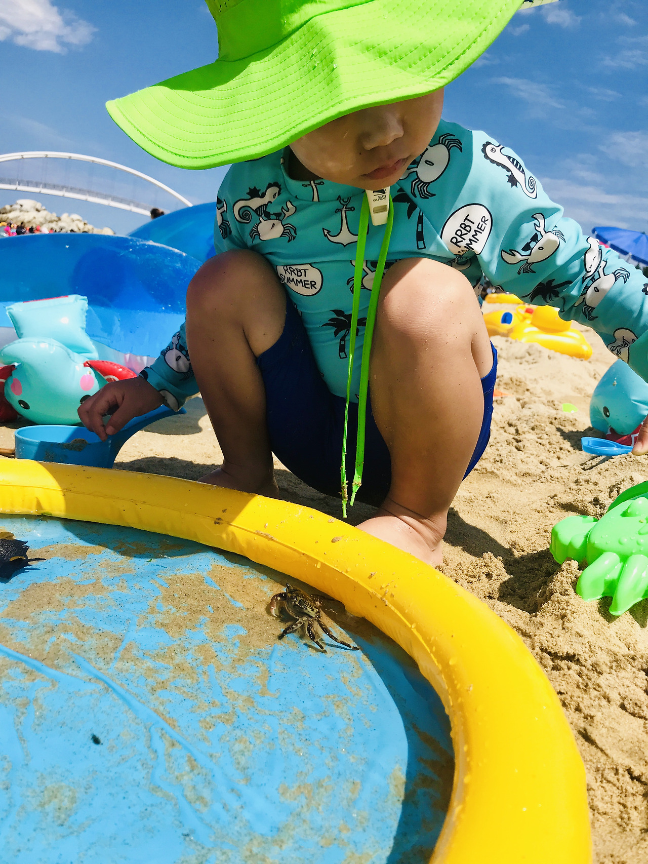 남애3리 해수욕장에는 방파제 너머엔 바위가 많다. 팔봉에서 만난 가족 중 체육선생님인 부부가 있는데, 물놀이하는 데 있어서도 굉장했다. 덕분에 유남매도 따라가 스노클링 맛보기에 신이나 바위틈에 있는 꽃게와 고둥 같은 온갖 바다생물을 직접 잡아보기도 했다. (물론 잡은 녀석들은 다시 바다로)
