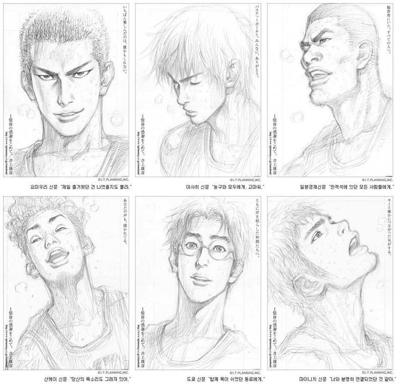 명장면들을 하나하나 곱씹어보며 나의 생각을 하나 둘 적다 보니 어느덧 글이 이렇게 길어졌는데, 마지막으로 이노우에 선생이 예전에 일본 주요 신문에 올린 슬램덩크 1억 부 판매 달성 기념/감사 광고 그림으로 이 긴 글을 마무리 짓겠다. 그림체가 슬램덩크보단 다음 작품인 배가본드에 더 가까워서 조금 아쉽지만, 이노우에 특유의 감성 터지는 글귀가 너무 멋져서 도저히 올리지 않을 수가 없다. 특히 서태웅 그림에 "농구와 모두에게, 고마워"라는 문구가 너무 멋지다.
