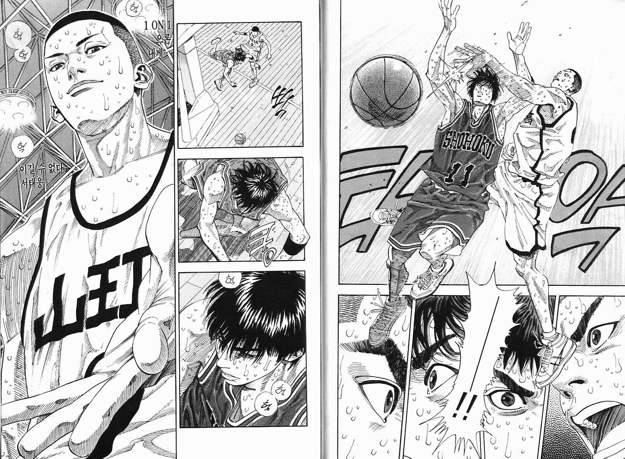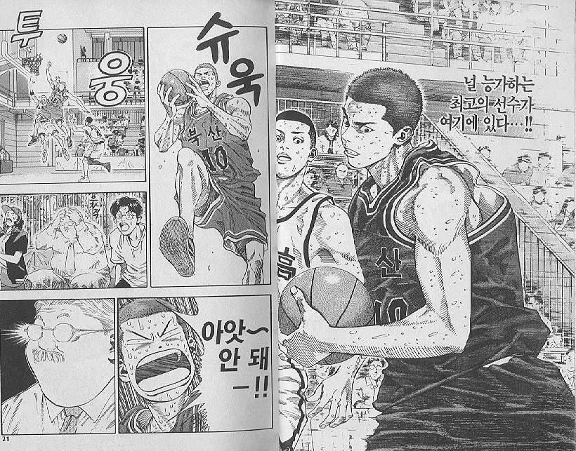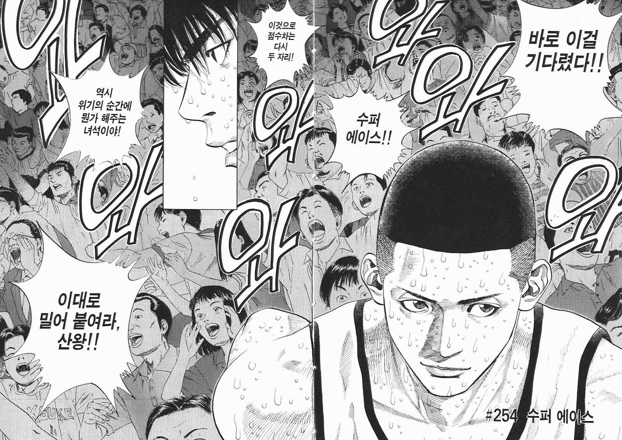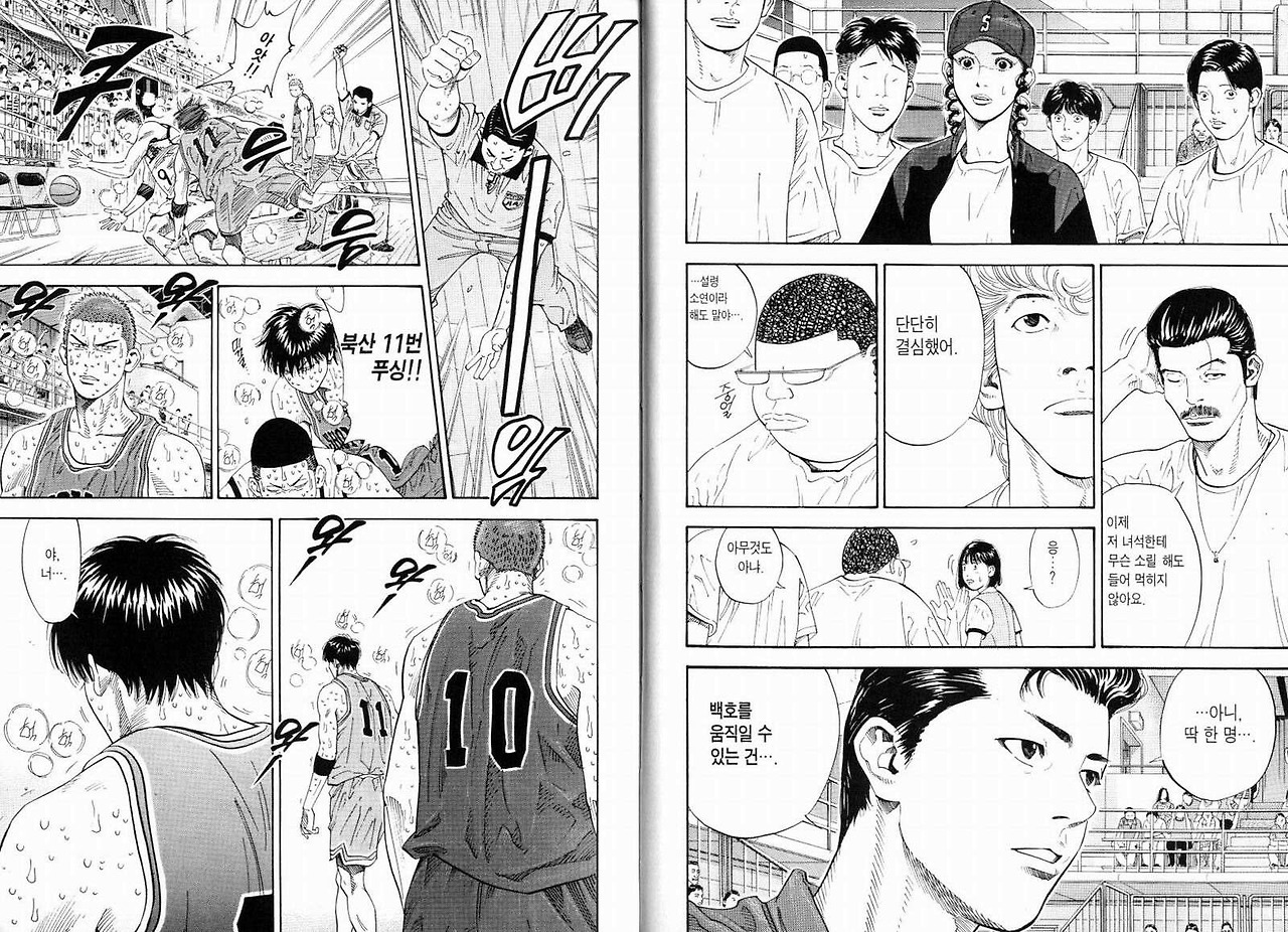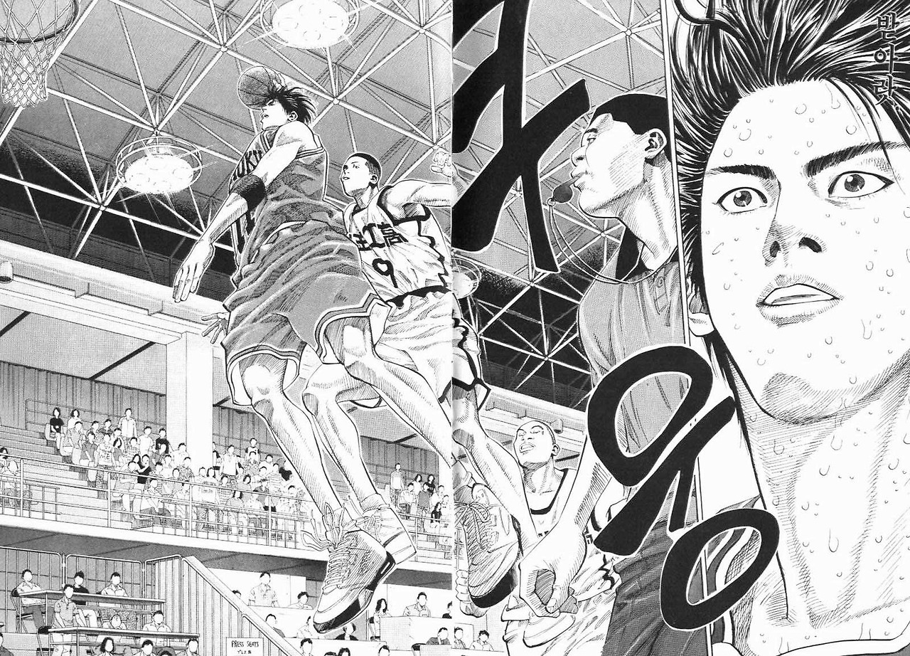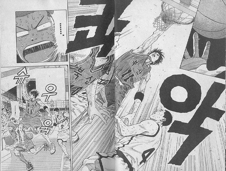 소연이가 1권에서 처음 말한 것처럼 백호는 산왕전에서 드디어 북산 농구부의 구세주이자 없어선 안될 선수가 된다. 여태까지 내가 고른 명장면에 송태섭이 단 한 번도, 잠깐이라도 등장하지 않는 걸 눈치채신 분들이 계실지 모르겠는데, 난 주요 인물 중 송태섭을 별로 좋아하지 않는다. 그 이유는 여기서 송태섭의 어이없는 실수로 인해 백호가 다치게 되었기 때문이다 (체력이 다 떨어져 제대로 뛰지도 못하는 상황에서도 끝까지 볼을 포기하지 않으려는 정대만의 모습도 정말 멋지다).