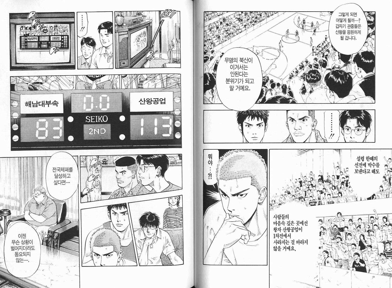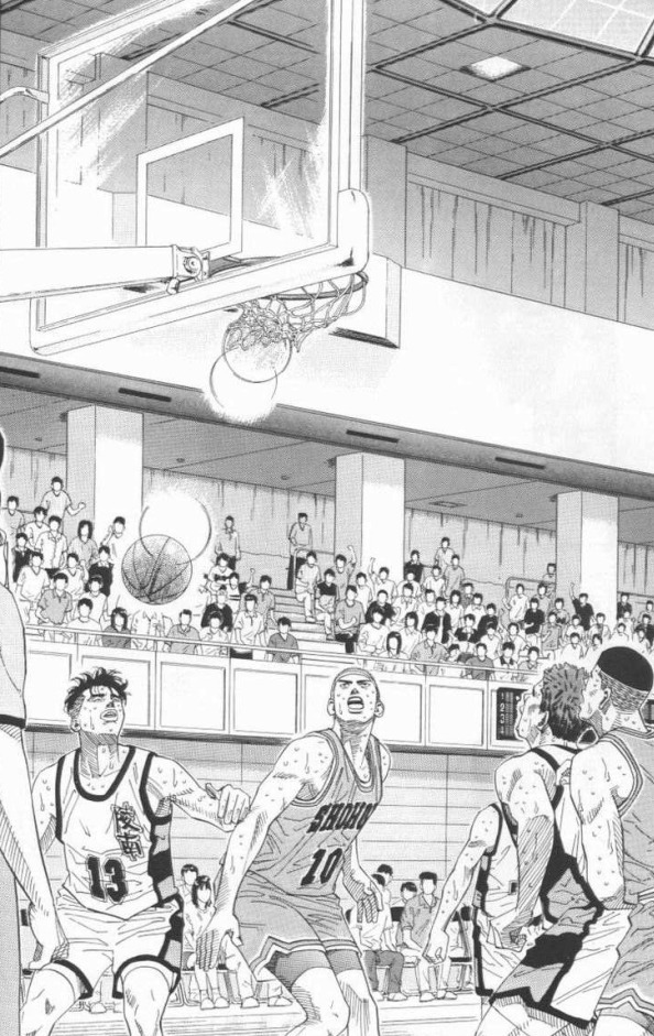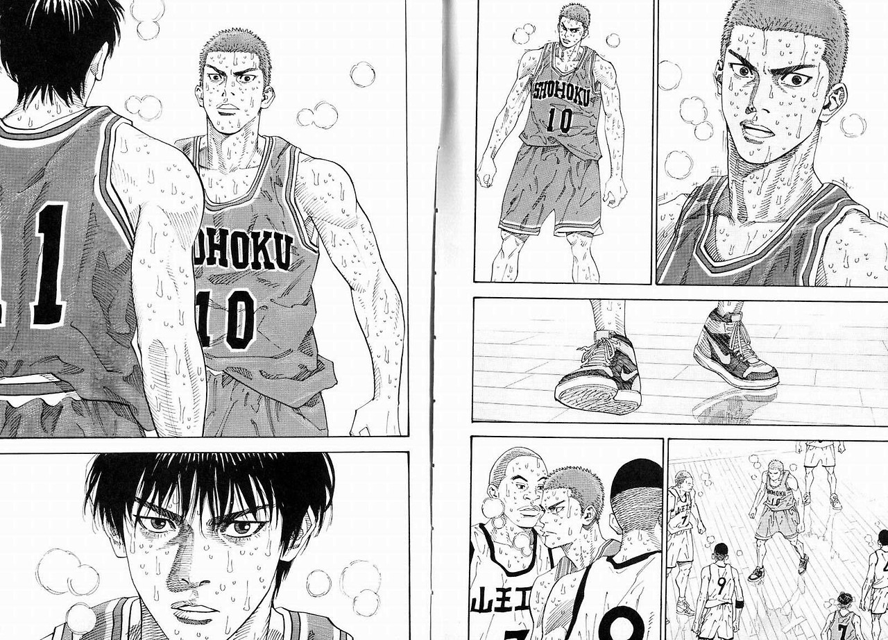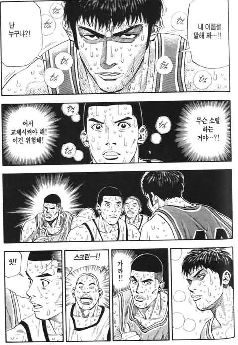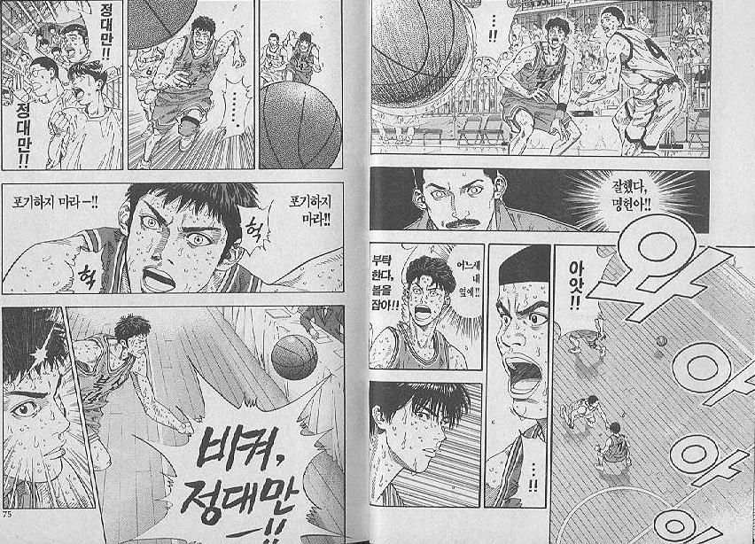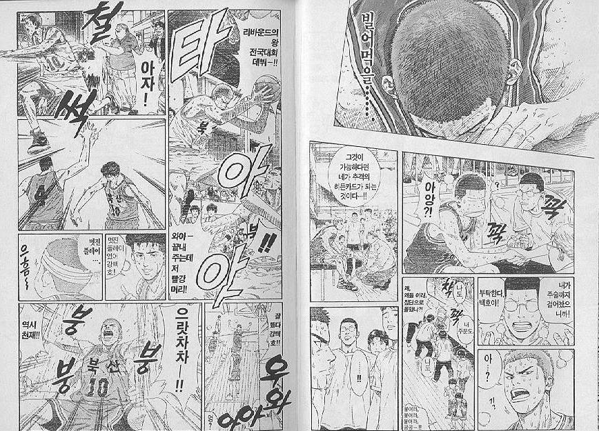 소연이가 1권에서 처음 말한 것처럼 백호는 산왕전에서 드디어 북산 농구부의 구세주이자 없어선 안될 선수가 된다. 여태까지 내가 고른 명장면에 송태섭이 단 한 번도, 잠깐이라도 등장하지 않는 걸 눈치채신 분들이 계실지 모르겠는데, 난 주요 인물 중 송태섭을 별로 좋아하지 않는다. 그 이유는 여기서 송태섭의 어이없는 실수로 인해 백호가 다치게 되었기 때문이다 (체력이 다 떨어져 제대로 뛰지도 못하는 상황에서도 끝까지 볼을 포기하지 않으려는 정대만의 모습도 정말 멋지다).