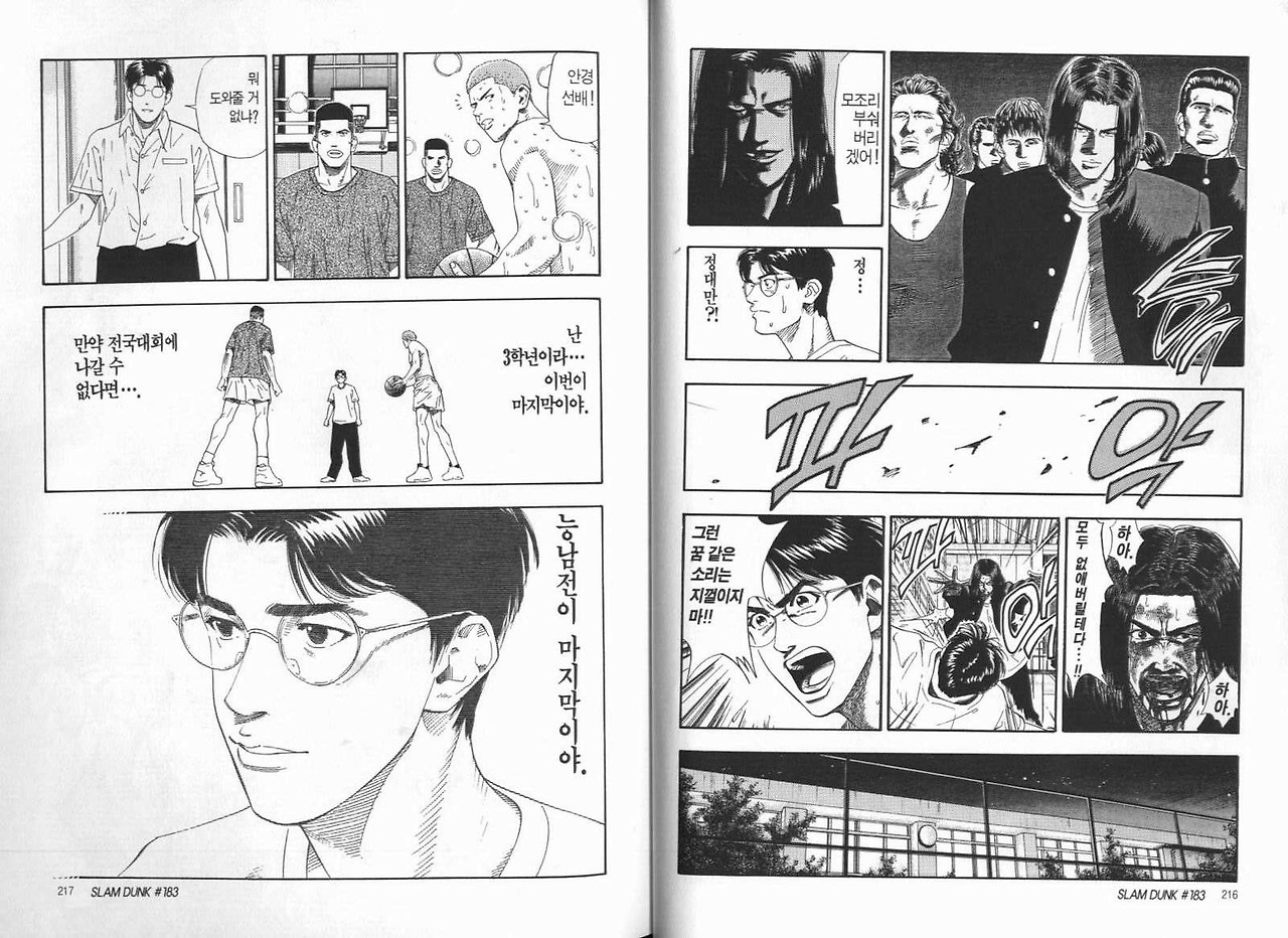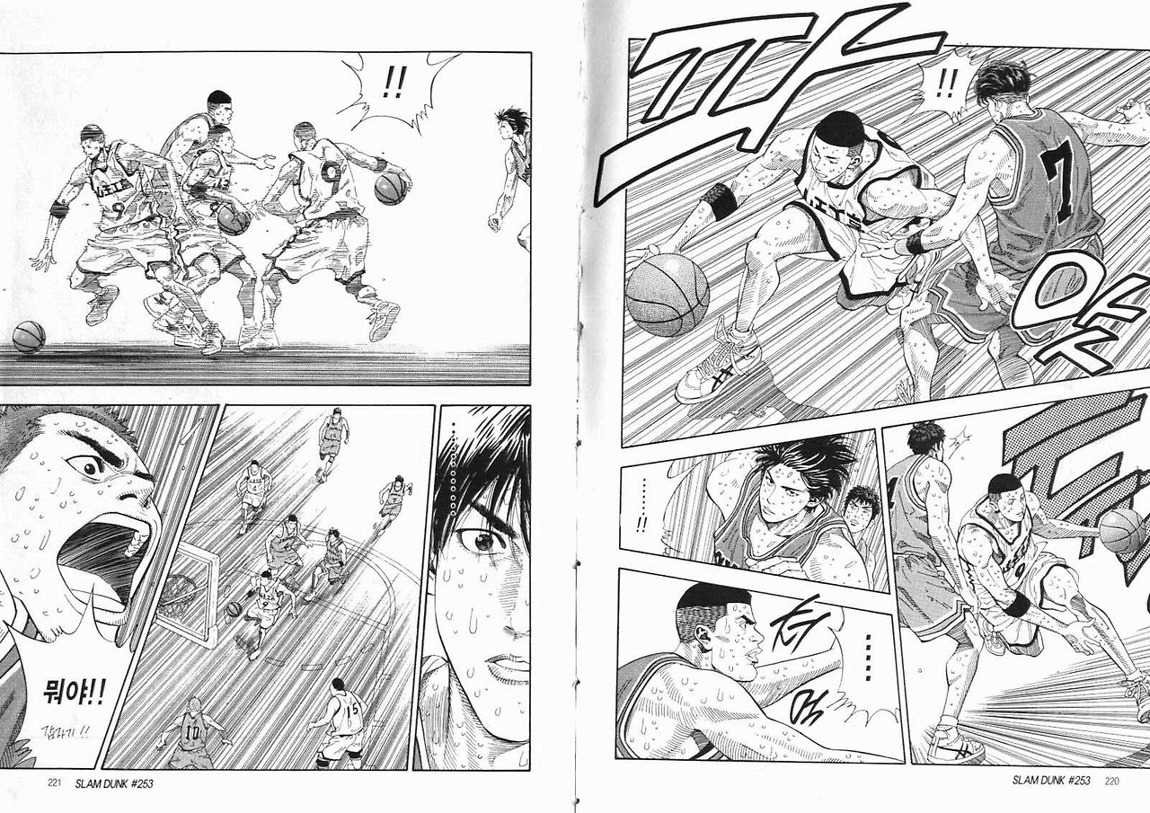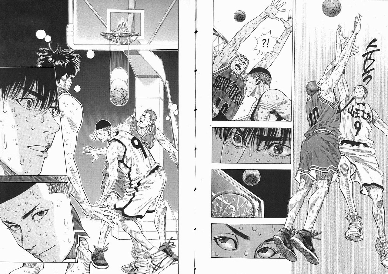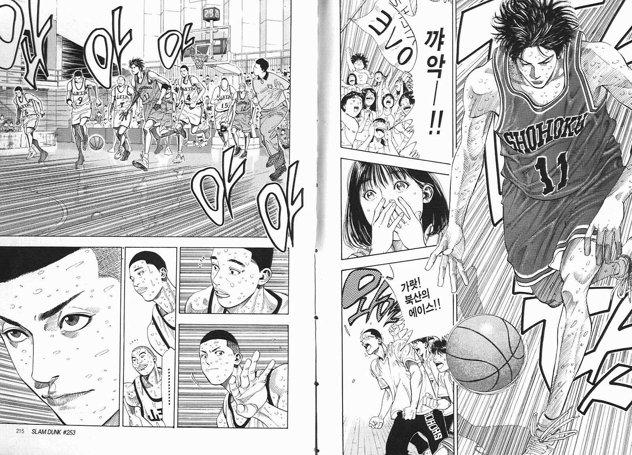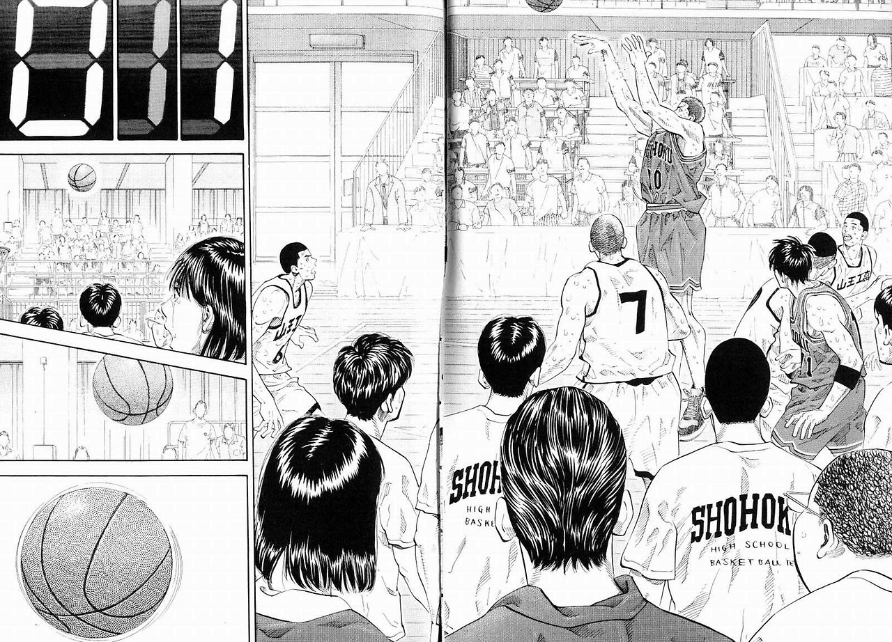 소연이가 1권에서 처음 말한 것처럼 백호는 산왕전에서 드디어 북산 농구부의 구세주이자 없어선 안될 선수가 된다. 여태까지 내가 고른 명장면에 송태섭이 단 한 번도, 잠깐이라도 등장하지 않는 걸 눈치채신 분들이 계실지 모르겠는데, 난 주요 인물 중 송태섭을 별로 좋아하지 않는다. 그 이유는 여기서 송태섭의 어이없는 실수로 인해 백호가 다치게 되었기 때문이다 (체력이 다 떨어져 제대로 뛰지도 못하는 상황에서도 끝까지 볼을 포기하지 않으려는 정대만의 모습도 정말 멋지다).