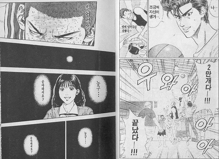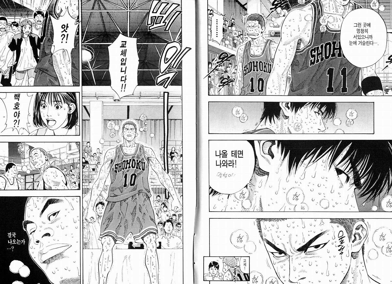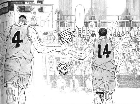 등 부상으로 인한 통증으로 인해 기절한 사이 몇 달간 짧았던 바스켓볼 커리어에서 즐거웠던 순간들을 추억하다가 벌떡 일어나 소연이에게 농구를 정말 좋아한다고 고백하는 장면은 스포츠 만화 중 최고의 고백 장면이 아닐까 생각된다. 많은 사람들이 아다치 미츠루 감성을 좋아하지만, 나는 개인적으로 H2/터치 감성보다 산왕전 고백 감성이 더 와닿는다. 비록 소연이에게 잘 보이려 시작한 농구였지만, 4개월 간 농구의 매력에 정말 푹 빠져 진짜 바스켓맨이 되어버린 백호, 과연 소연이를 좋아한다고 고백하는 건지, 농구가 좋다고 이야기하는 건지 애매모호해서 더 좋다.