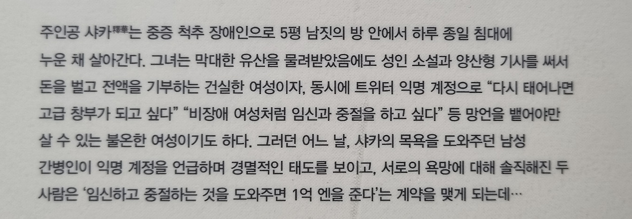 「헌치백」의 주인공은 문제적 인물이라고 할 수도 있다. 비장애인 여성이 할 수 있는 임신을 경험해보고 싶은 욕망을 이해하기는 어렵지 않으나 중절을 해보고 싶다는 욕망은 어떠한가? 간병인에게 거액을 주며 자신의 욕망을 실현해 달라고 말하는 건 어떨까? 고급 창부가 되고 싶다고 말하는 건... 아래 종이책을 증오하는 화자의 문장을 인용해 본다.