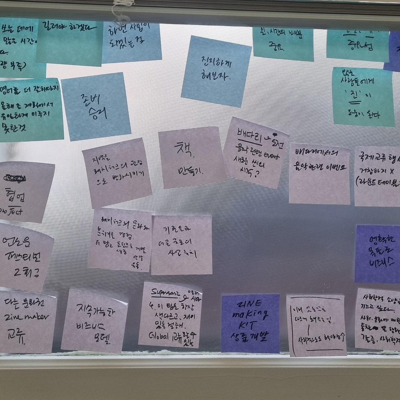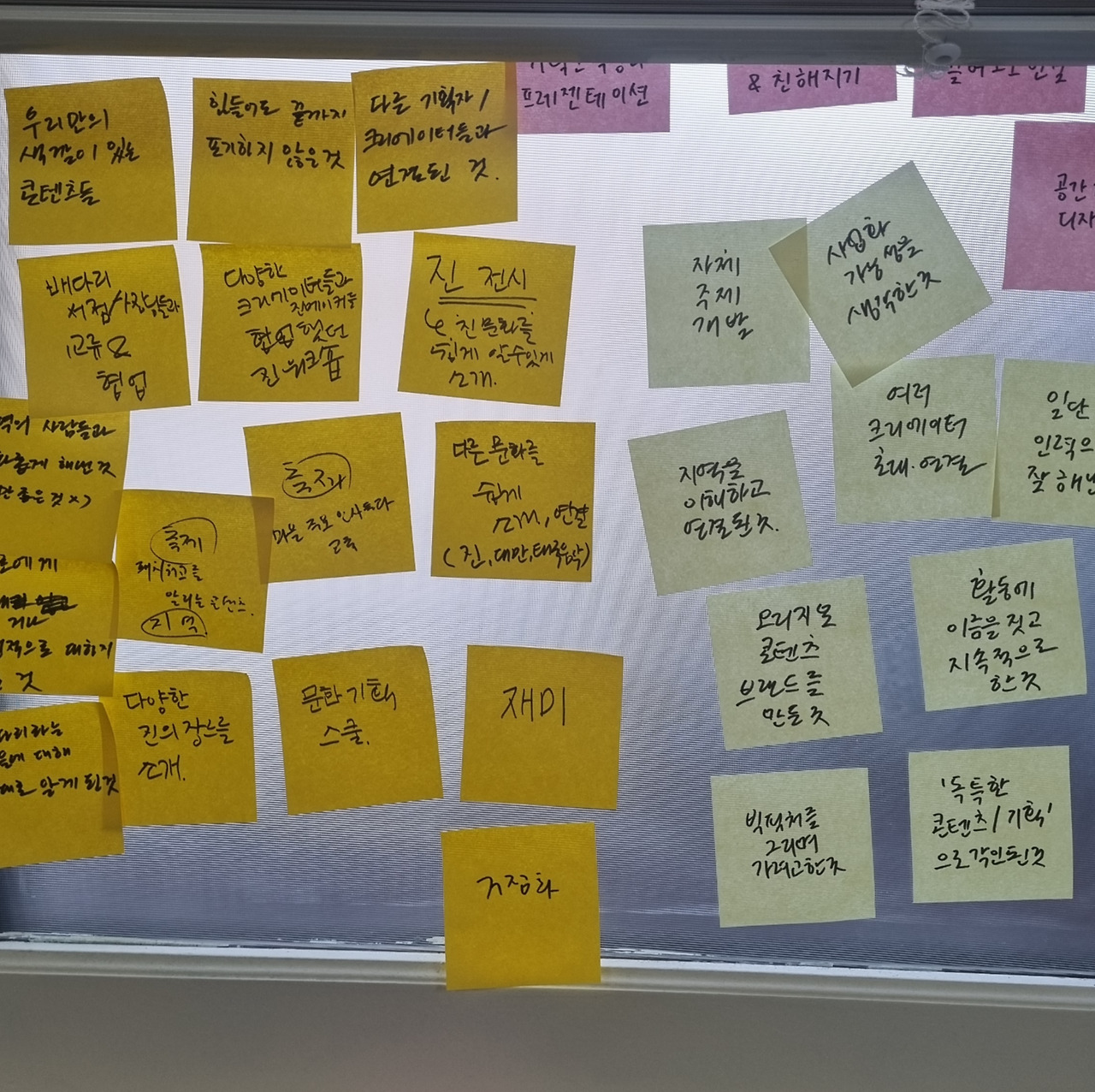 아마 위와 같은 원칙을 세우고 실행까지 옮기기까지는 운영진 분들의 고민과 노력이 많았을 것 같다. 그걸 해내는게 이들이 똑똑이라는 증거같기도 하고. 창문에 붙어 있는 포스트잇을 도촬했다. 브랜드를 만들며 했던 고민들 같은데 흥미로운 내용이 많았다.