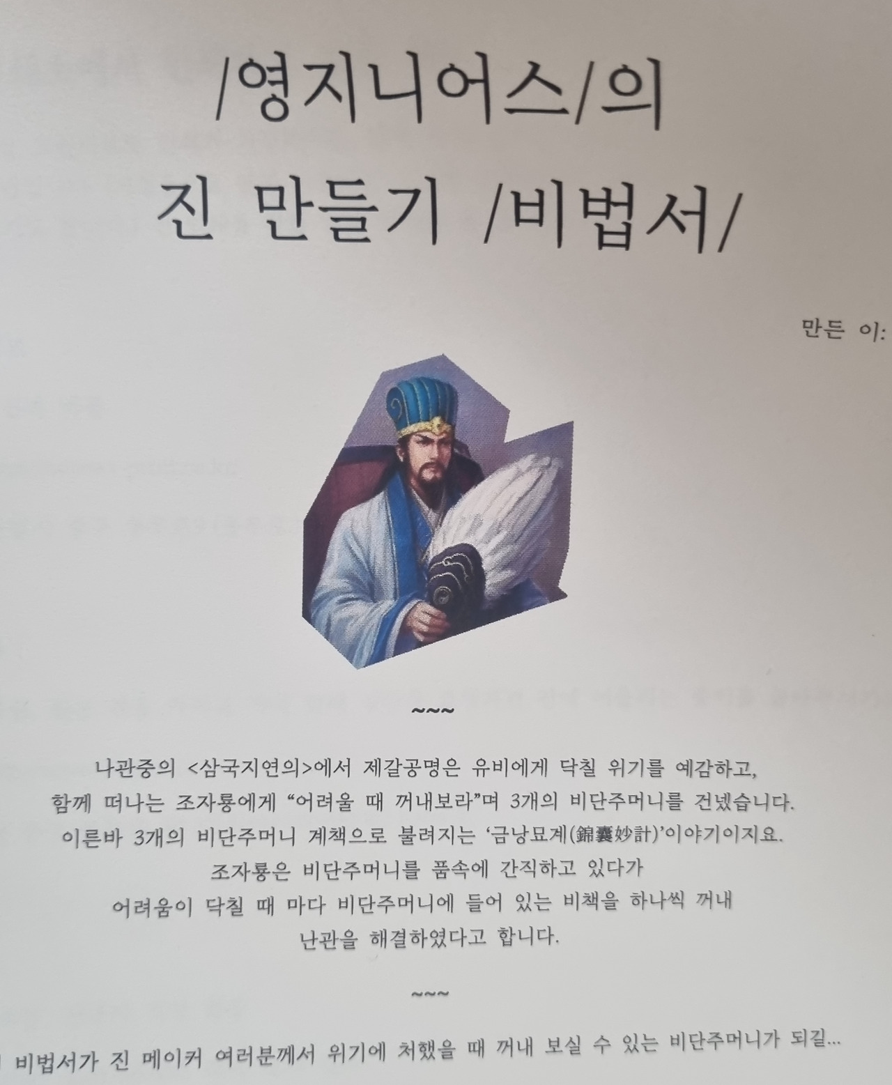 마지막으로 서로의 작업물을 돌아가며 소개하고, 소감을 말했다. 따뜻한 사람들을 많이 만났고, 그들의 지지를 동력 삼아 무엇이든 만들어볼 수 있는 분위기를 체험한 것이 가장 큰 수확이 아닐까 싶다. 무엇보다 함께 무언가를 만드는 일의 가치와 힘을 느꼈다. 참여자 모두 서로 응원을 남기며 헤어졌는데 물론 프로그램에 참여하는 건 비용이 들고 일시적인 기회일 수 있지만 이 과정을 통해 Zine을 만들고 있는 사람이라는 정체성을 획득하고 커뮤니티 안에 속해있음을 확실하게 느껴볼 수 있었기에 값진 경험이었다. 물론 여건이 된다면 다시 또 배다리에서 Zine 만들기에 참여할 것이다. 아니라도 Zine을 만들고 있다 보면 반드시 다시 만나게 되리라는 좋은 예감이 풍겼달까... 위급할 때 풀어보라고 비법서도 주셨다.