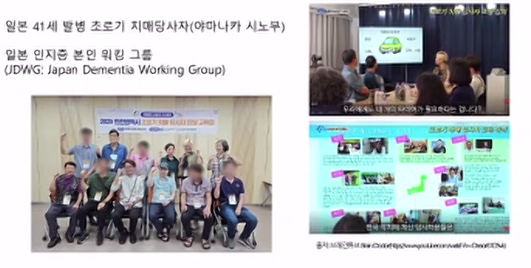 일본 41세 발병 초로기 치매당사자인 야마나카 시노부 / 일본 인지증 본인 워킹 그룹 (JDWG)의 사례를 소개해주셨다. 일본의 경우 치매당사자가 적극적으로 모임, 강연 등 활동을 해나가고 있다.