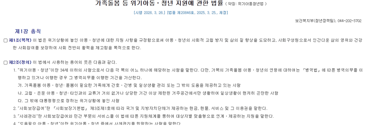 주돌봄자, 협력해야 할 다른 사람이 없을 때 청(소)년이 돌봄을 도맡아야 할 경우가 생긴다. 다행히 가족돌봄 등 위기아동 청년 지원에 관한 법률이 신설되어 2026년 시행된다고 한다. 법률에는 청년미래센터를 열고 이들이 받을 수 있는 복지를 통합적으로 제공하는 등의 여러 지원이 도입되었다.