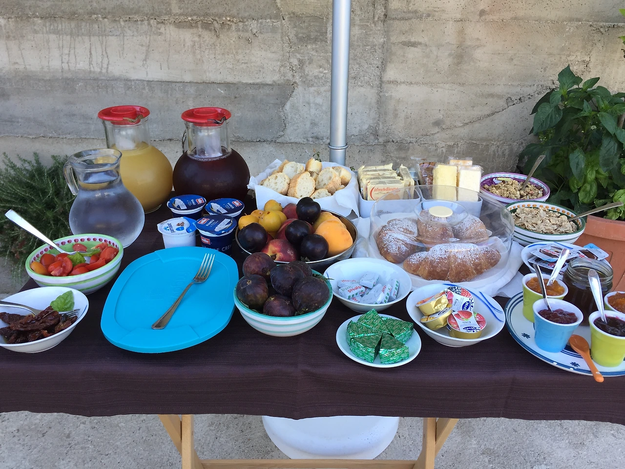 까를로의 비앤비는 Bed & Breakfast라는 이름답게, 조식을 제공해주었다. 룸이라고 해봤자 2인용 룸 3개뿐이라서, 조식 테이블도 2인용 테이블 3개 뿐이다. 날씨가 좋아서 테이블은 야외에 세팅되어 있었다. 마당에 차려진 테이블에 자리를 잡고 앉았다. 까를로가 아침식사에 대해 설명해주었다. 선드라이드 토마토와 샐러드는 집에서 키운 토마토와 바질로 만들었고, 테이블 한켠에 세팅된 잼들도 모두 직접 만든 홈메이드 잼이니까 맛있게 많이 먹으라는 말도 빼놓지 않았다.