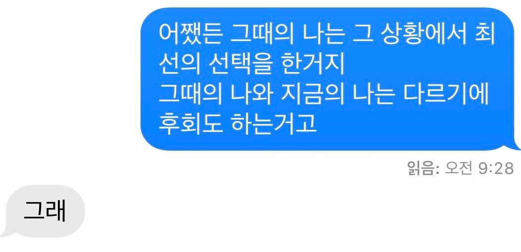 뼈가 아플 정도로 후회하며 몇 년의 시간을 보낸 후, 이제야 나는 과거의 나를 끌어안을 수 있게 되었다. 비록 지금도 낮은 곳에 있는 나지만, 어리고 여렸던 그 시절 나에게 책임을 전가하지 않는다. 후회는 남아있지만 더 이상 과거를 미워하지 않는다.