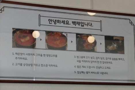벽면에 걸려있는 포스터에서‘김치찌개를 맛있게 먹는 방법’에 대해 다음과 같이 안내해주고 있다.