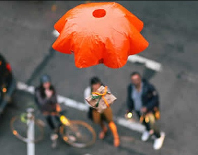그러면 주문한 샌드위치가 하늘에서 작은 비닐 낙하산을 타고 내려온다.