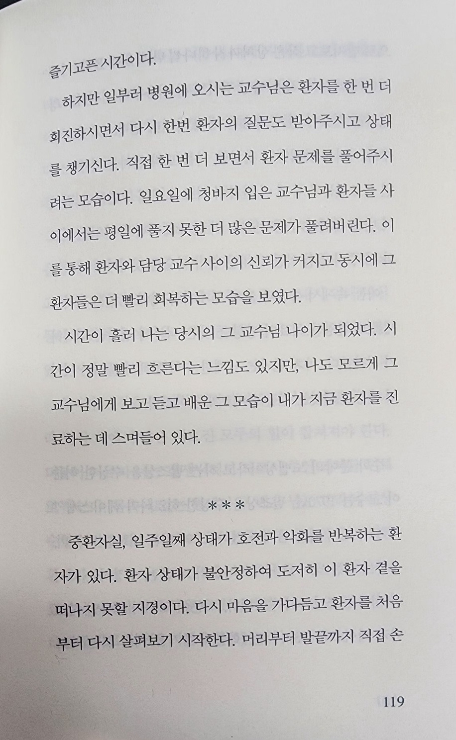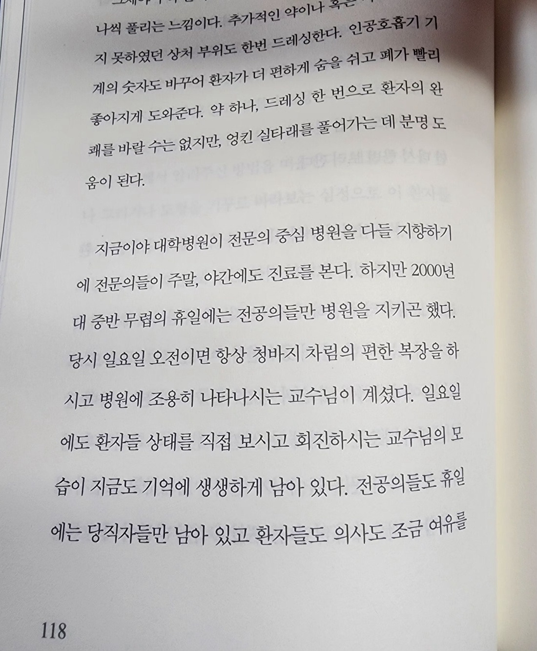 지금이야 대학병원이 전문의 중심 병원을 다들 지향하기에 전문의들이 주말, 야간에도 진료를 본다. 하지만 2000년 대 중반 무렵의 휴일에는 전공의들만 병원을 지키곤 했다. 당시 일요일 오전이면 항상 청바지 차림의 편한 복장을 하시고 병원에 조용히 나타나시는 교수님이 계셨다. 일요일에도 환자들 상태를 직접 보시고 회진하시는 교수님 모습이 지금도 생생하게 남아 있다. 전공의들도 휴일에는 당직자들만 남아 있고 환자들도 의사도 조금 여유를 즐기고픈 시간이다.