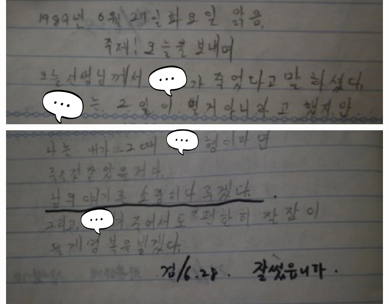 10살 어린 나이에 그 아픔을 가슴에 묻어두었고 너무나 충격이었기에 다시 생각하고 싶지 않았다. 하지만 그날 충격을 나는 일기장에 몇 자 적어놓았다.