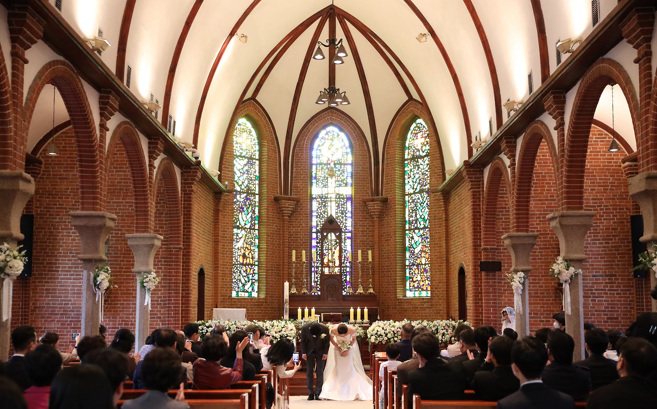 성당 예식은 보통 그 성당에서 우리 예식만 진행이 되기에 평화롭고, 찾아보면 아름다운 공간도 많다. 스테인드글라스 사이로 빛이 들어오는 오후, 신부님 앞에서 혼인서약을 하니 하늘아래 인연임을 맹세하는 기분이다. 교회법으로도 혼인서약은 평생 한 사람과 할 수 있다.