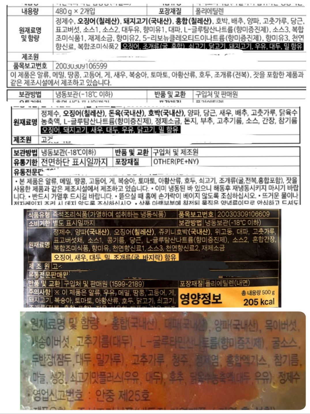 나 역시 이런 HMR을 먹어봤고, 괜찮게 생각한 상품도 있었다. 습관처럼 뒷면을 뒤집어 본 결과, 재미있는 사실을 발견해 글로 남겨보고자 한다. 아래 사진은 꾸준히 인기를 얻고 있는 맛집 혹은 셰프 브랜드의 짬뽕이다. 유통채널마다 높은 순위를 기록하고 있는 판매 우수 상품들이다. 모두들 여기서만 only 임을 내세운다.