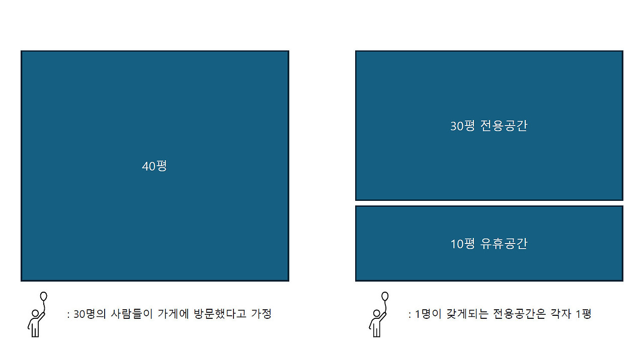 [그림1]과 같이 40평의 가게에 30명의 사람들이 방문했다고 가정해봅시다. 단순하게 40평을 모두 전용공간으로 사용한면 30명의 개개인이 느끼는 개인의 공간은 약 1.33평이 됩니다.