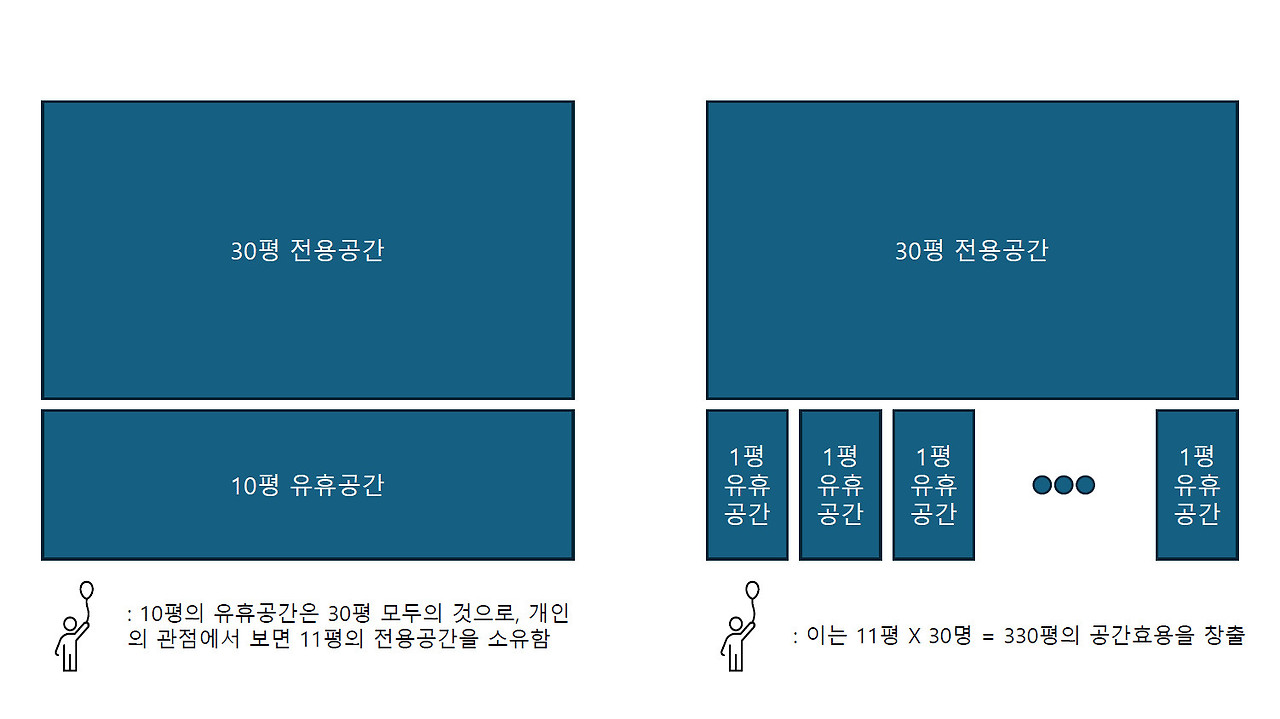 이때 30평을 전용면적, 10평을 유휴공간으로 배치할 경우 개인이 가질 수 있는 전용면적은 1평이 되며, 나머지 10평이라는 유휴공간은 모두의 공용공간으로 인식됩니다. 즉, 개인은 11평의 공간을 사용하는 것과 동일한 효과를 지니게 됩니다. 공간효용의 관점에서 볼 때 40평의 가게는 곧 330평이라는 공간효용을 창출하게 되는 것입니다.