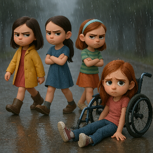 넘어진 소녀를 일으켜 주려 몇몇 친구들이 다가왔지만 소녀는 스스로 일어서려 거절했습니다. 그러자 그 친구들이 볼멘 목소리로