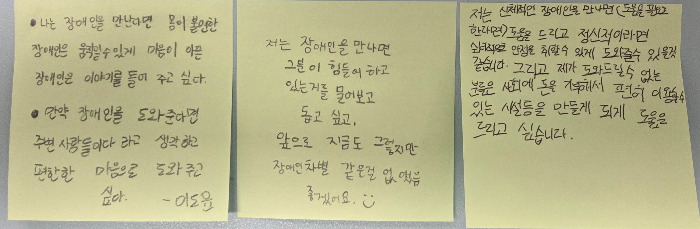 그러니 직접적으로 장애인을 만날 기회가 없다면 장애인식개선 교육을 통해 내가 아는 것이 전부가 아닐 수 있음을 경험해 볼 수 있었으면 좋겠습니다.