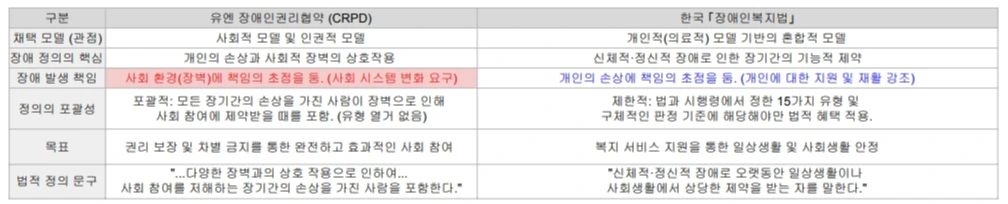 유엔 장애인권리협약의 정의와 한국의 장애인복지법상의 장애인의 정의에 있어 어떤 차이점이 있는지 느껴지시나요?