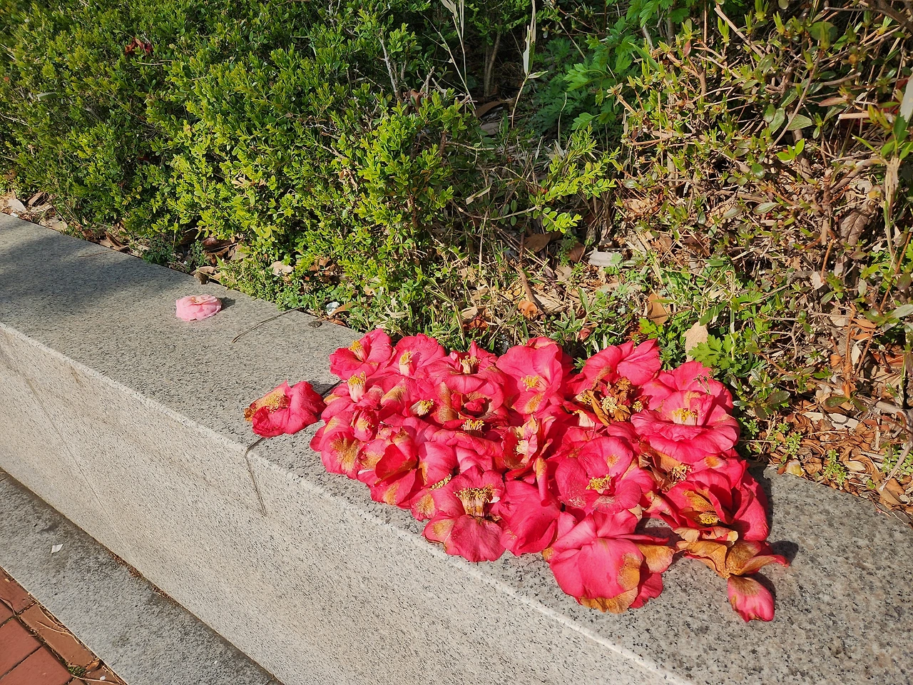 동백섬의 동백나무 아래 누군가 모아둔 낙화